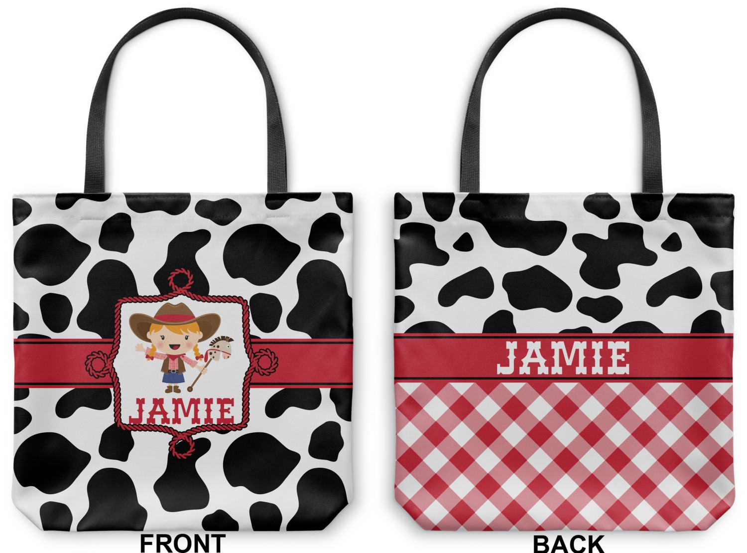 This western themed design is perfect a cowboy or cowgirl. The background is cow print, with a red ribbon in the center. The label is made of rope and you can customize it by choosing a cowgirl or a cowboy.