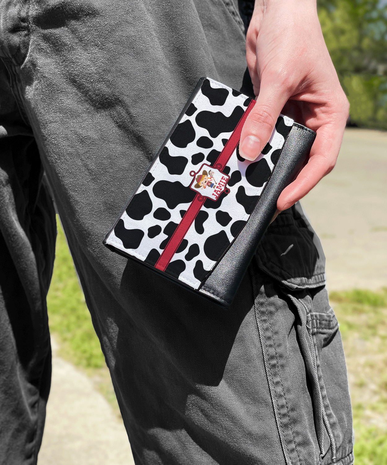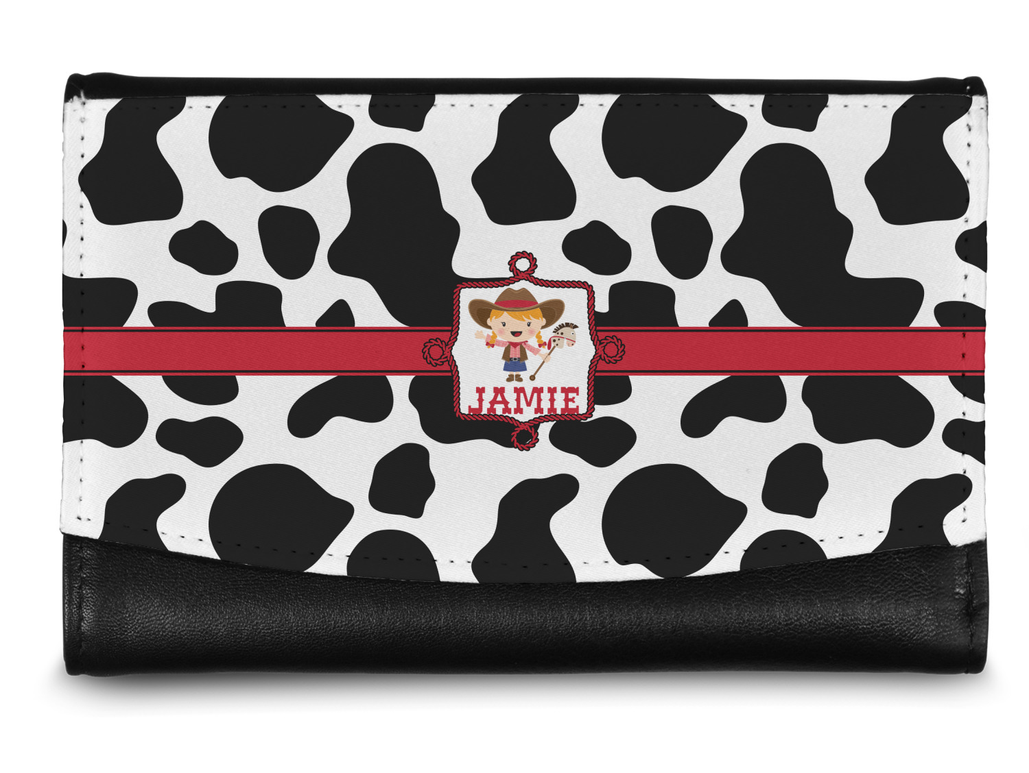 This western themed design is perfect a cowboy or cowgirl. The background is cow print, with a red ribbon in the center. The label is made of rope and you can customize it by choosing a cowgirl or a cowboy.