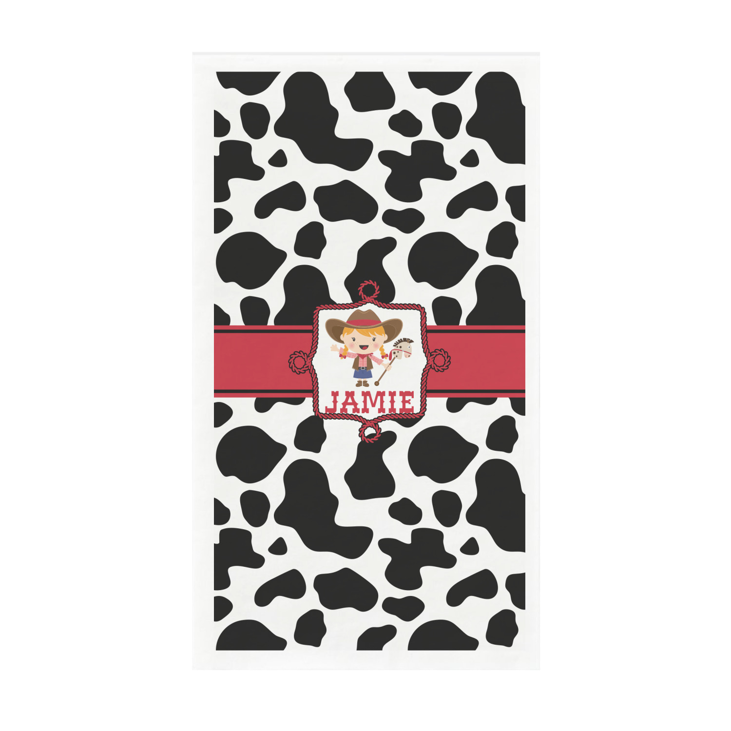 This western themed design is perfect a cowboy or cowgirl. The background is cow print, with a red ribbon in the center. The label is made of rope and you can customize it by choosing a cowgirl or a cowboy.