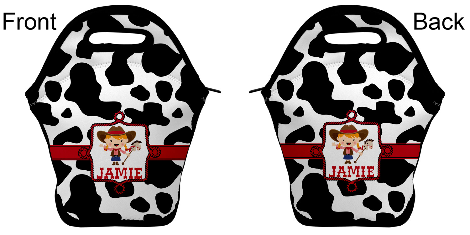 Our personalized lunch bags are made from a strong neoprene, and secure with a zipper closure that lines the top of the bag.The edges of the neoprene are sewn together with a heavy duty stitch, adding to the durability of the bag. The is accompanied by a reinforced handle at its top, for the easy transport of your lunch. We display your personalization across both the front and back of this neoprene lunch bag, while the remaining sides are a sleek black in color. Each bag measures at 13.5 inches tall, and 11.5 inches wide.