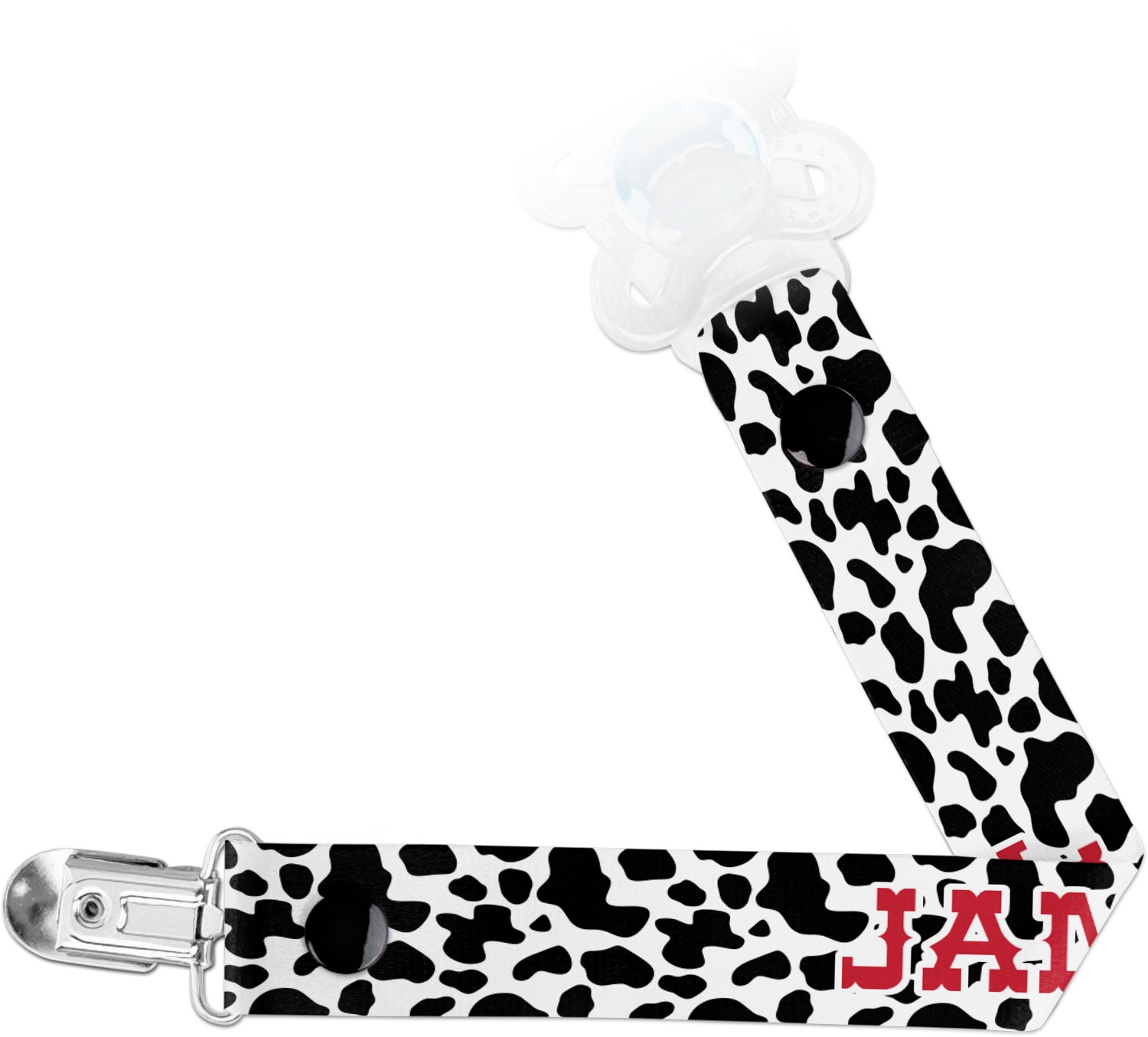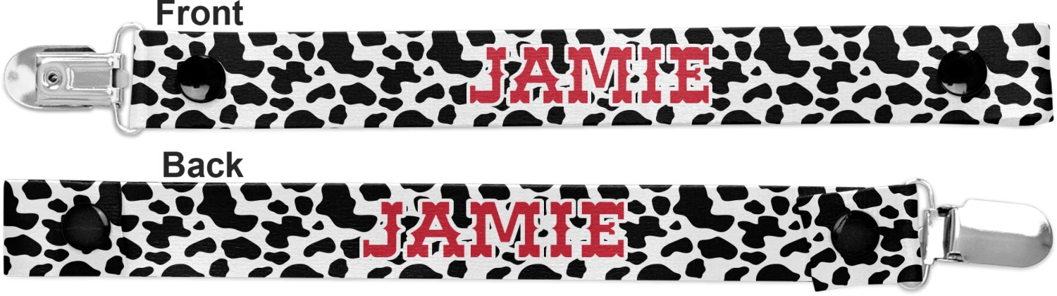 This personalized pacifier clip is the ideal size and measures at approximately 7.5 inches in length, when either end is snapped closed. On one end, you'll find a snap button. This button of your baby's pacifier holder is what can be attached to their pacifier to hold is securely in place. Simply open the snap, slip it through the pacifier opening, and snap it back into place. On the opposite end of this baby pacifier holder, you'll find a metal clip that can secure to a baby's collar or sleeve. This clip ensures that the strap stays in place, and that your baby's pacifier is always on hand.