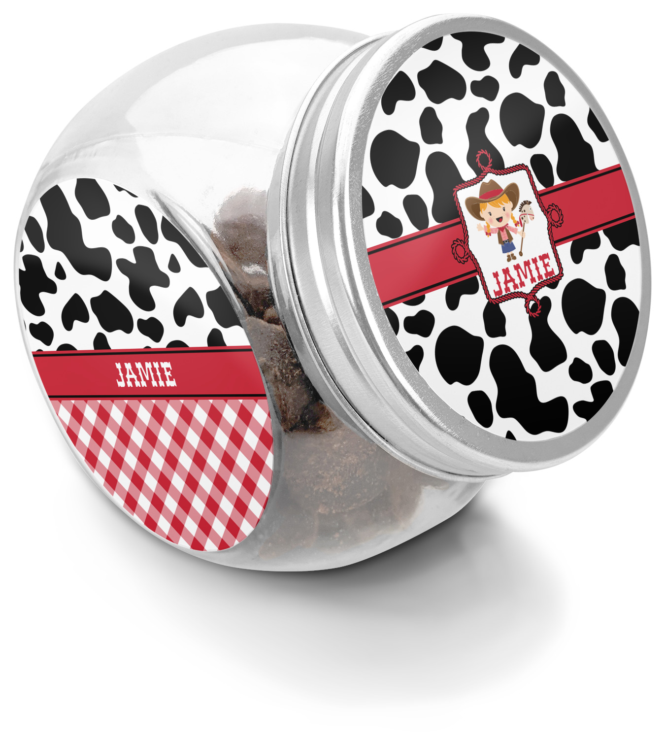 This western themed design is perfect a cowboy or cowgirl. The background is cow print, with a red ribbon in the center. The label is made of rope and you can customize it by choosing a cowgirl or a cowboy.
