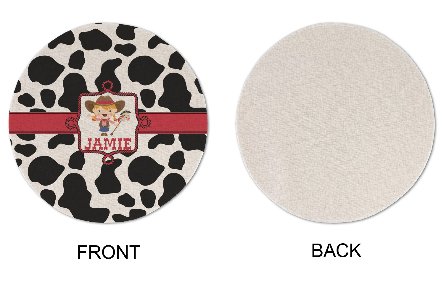 This western themed design is perfect a cowboy or cowgirl. The background is cow print, with a red ribbon in the center. The label is made of rope and you can customize it by choosing a cowgirl or a cowboy.