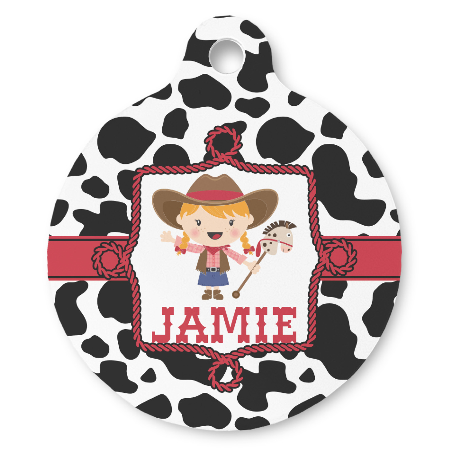 This western themed design is perfect a cowboy or cowgirl. The background is cow print, with a red ribbon in the center. The label is made of rope and you can customize it by choosing a cowgirl or a cowboy.