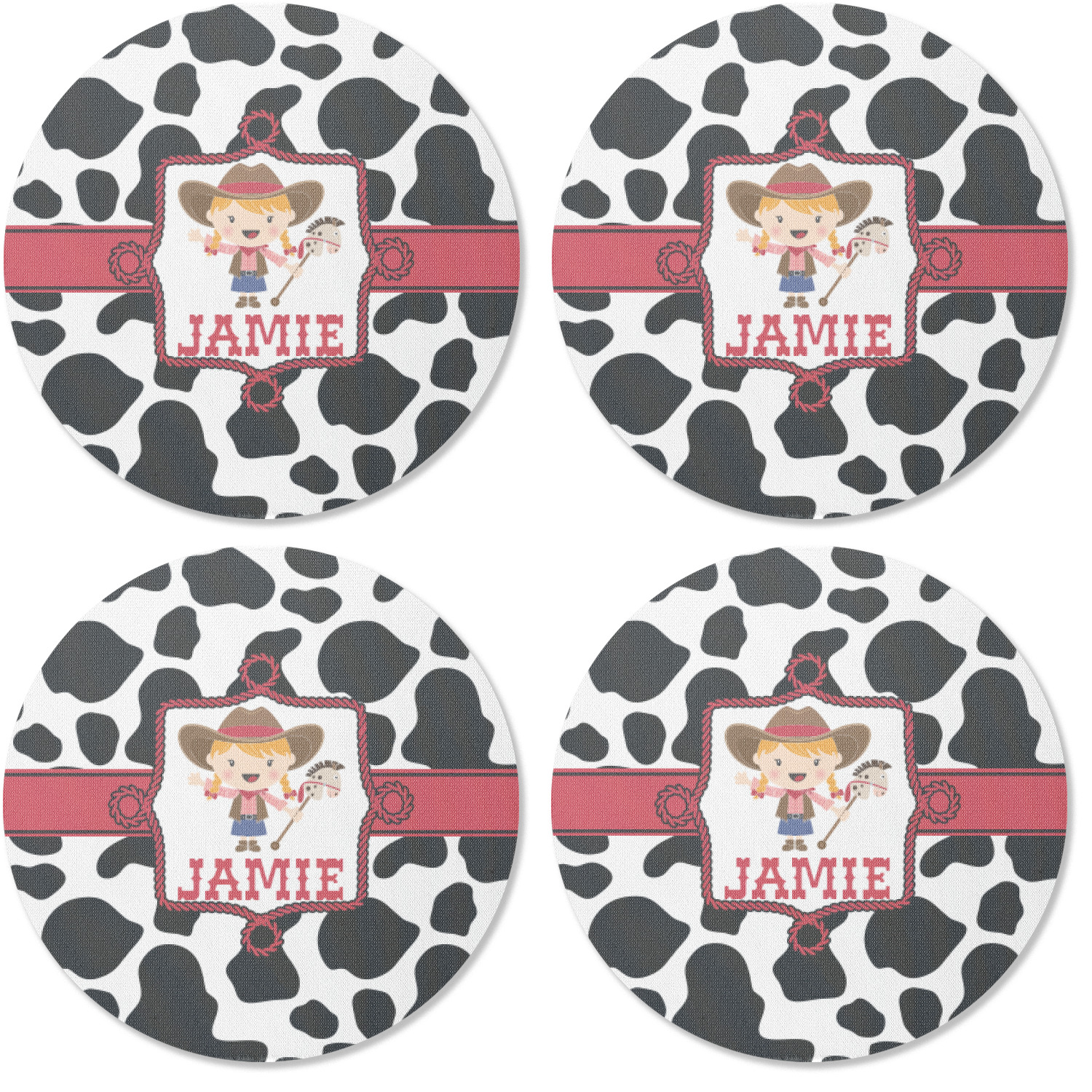 This western themed design is perfect a cowboy or cowgirl. The background is cow print, with a red ribbon in the center. The label is made of rope and you can customize it by choosing a cowgirl or a cowboy.