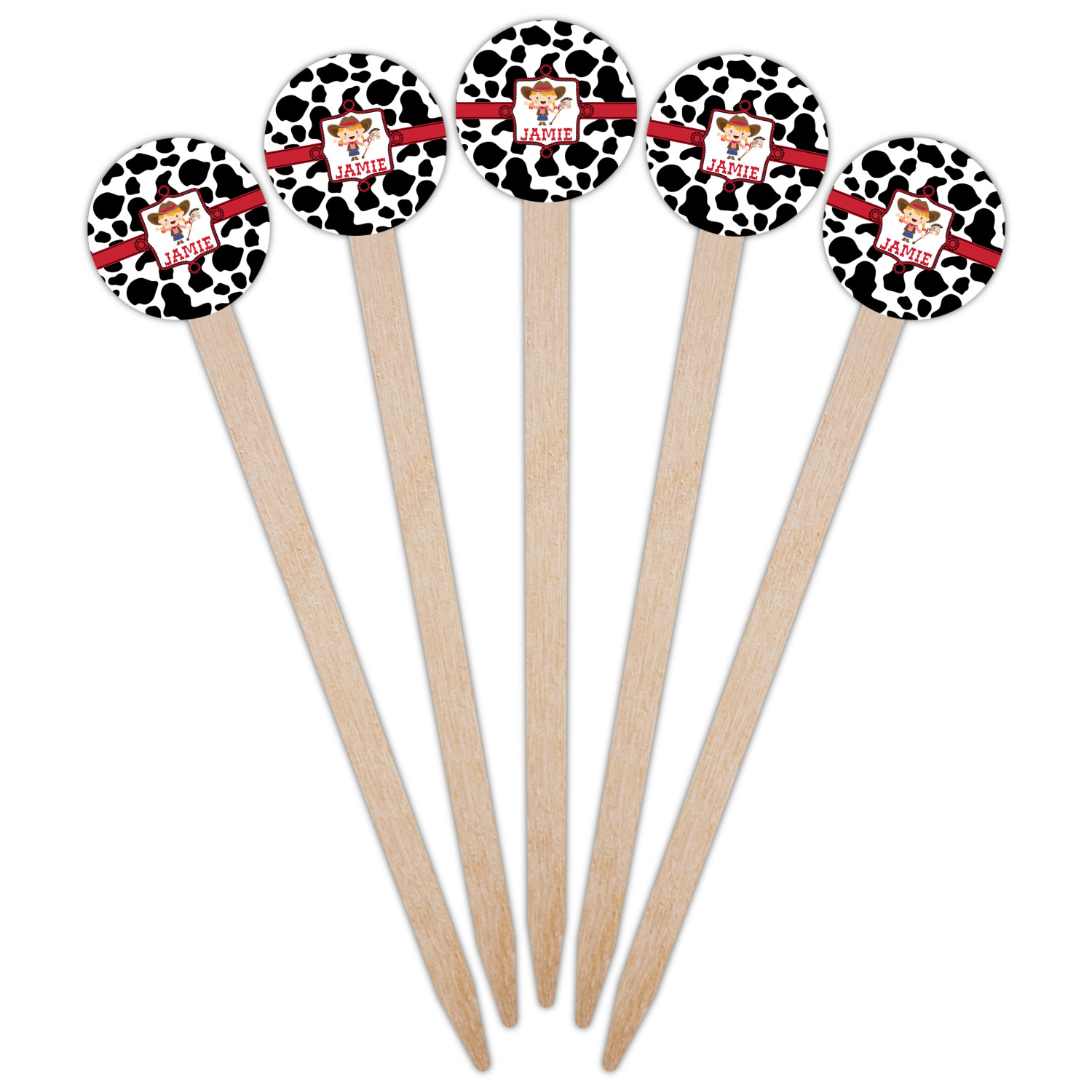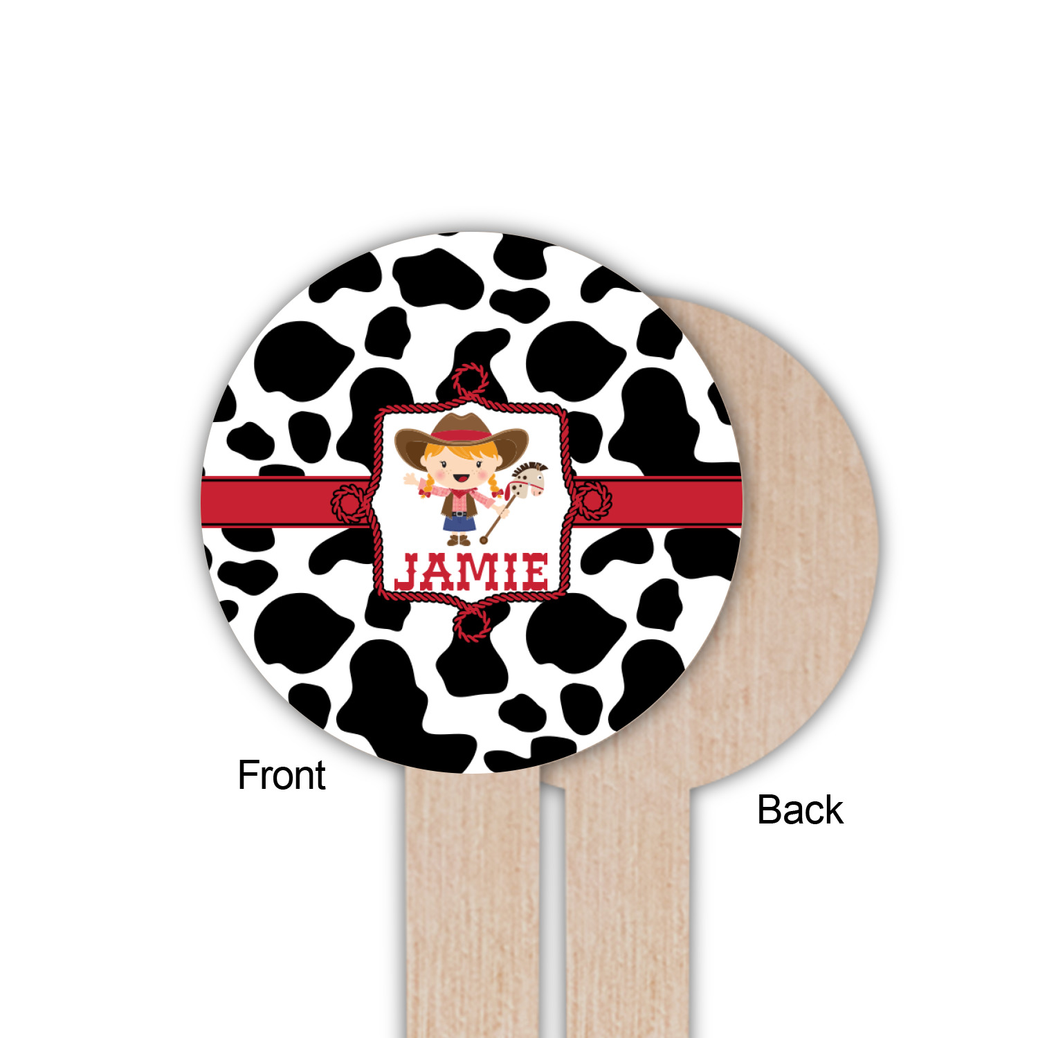 This western themed design is perfect a cowboy or cowgirl. The background is cow print, with a red ribbon in the center. The label is made of rope and you can customize it by choosing a cowgirl or a cowboy.