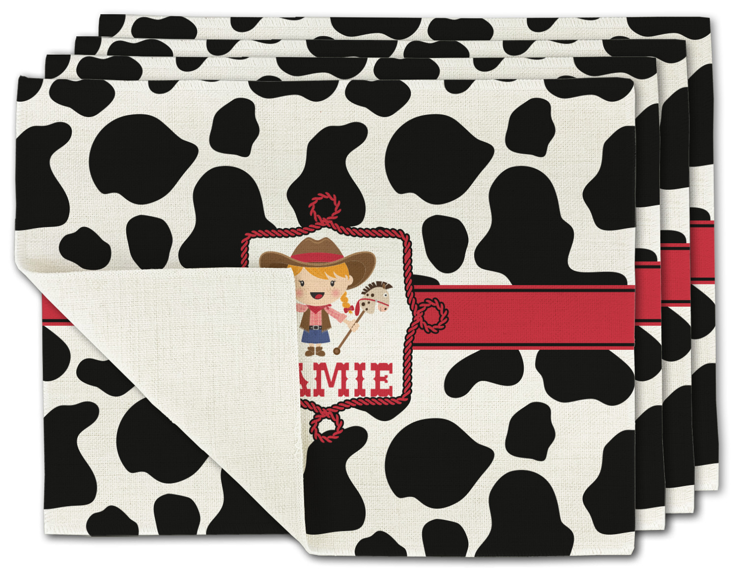 This western themed design is perfect a cowboy or cowgirl. The background is cow print, with a red ribbon in the center. The label is made of rope and you can customize it by choosing a cowgirl or a cowboy.