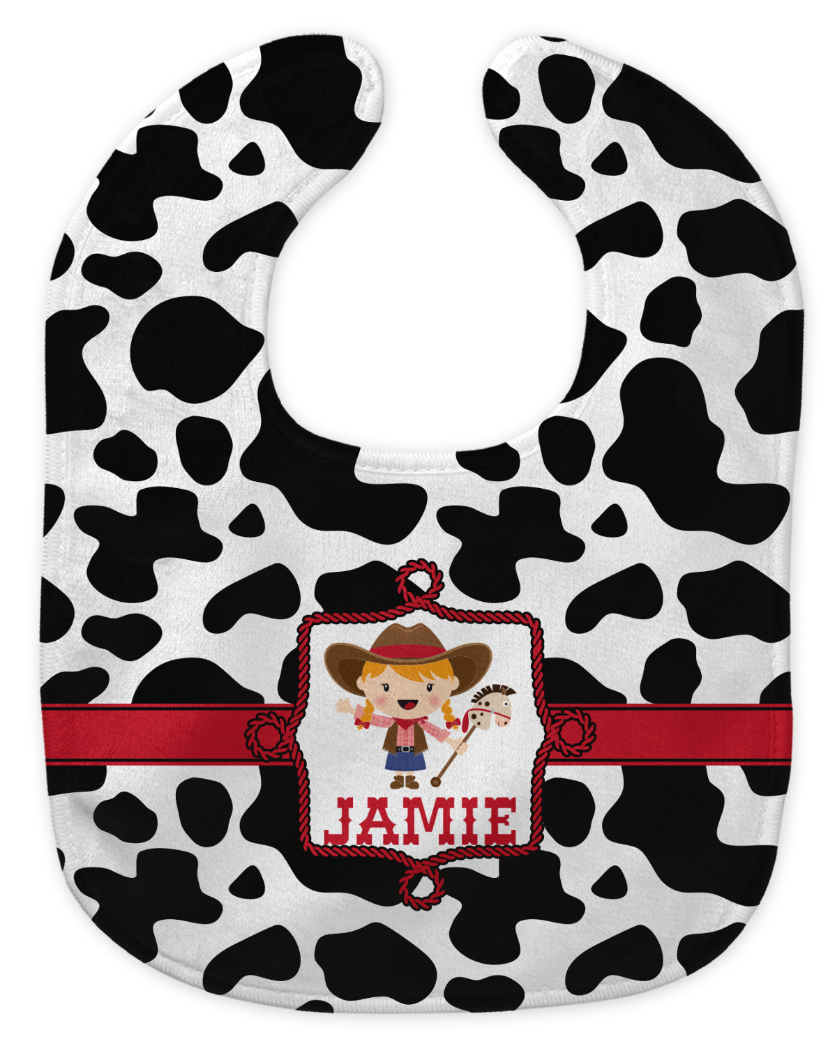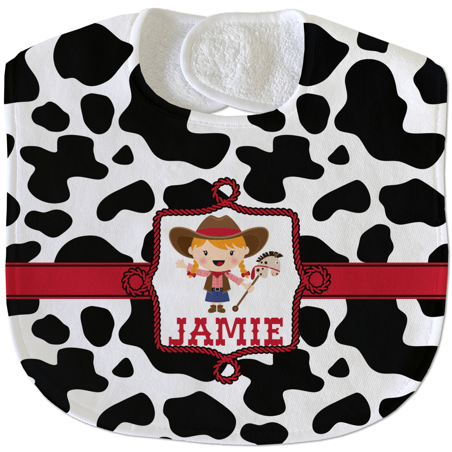 This western themed design is perfect a cowboy or cowgirl. The background is cow print, with a red ribbon in the center. The label is made of rope and you can customize it by choosing a cowgirl or a cowboy.