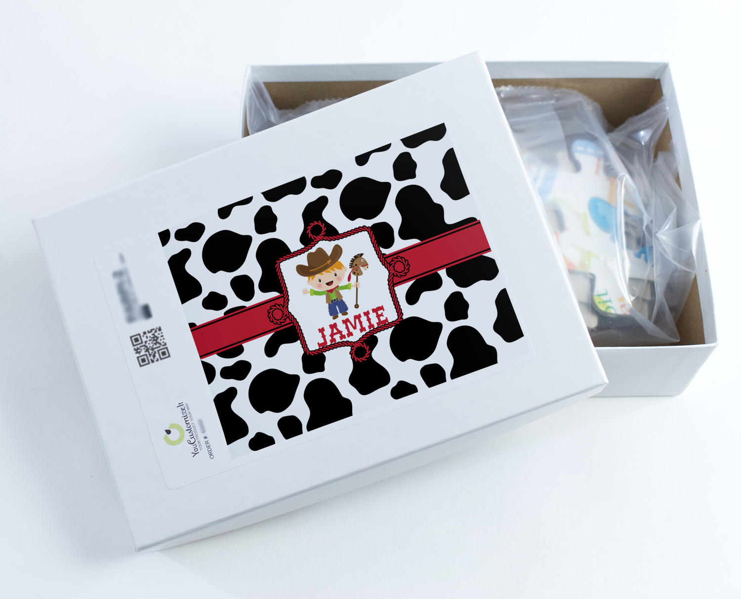 This western themed design is perfect for a cowboy or cowgirl. The background is cow print, with a red ribbon in the center. The label is made of rope and you can customize it by choosing a cowgirl or a cowboy.