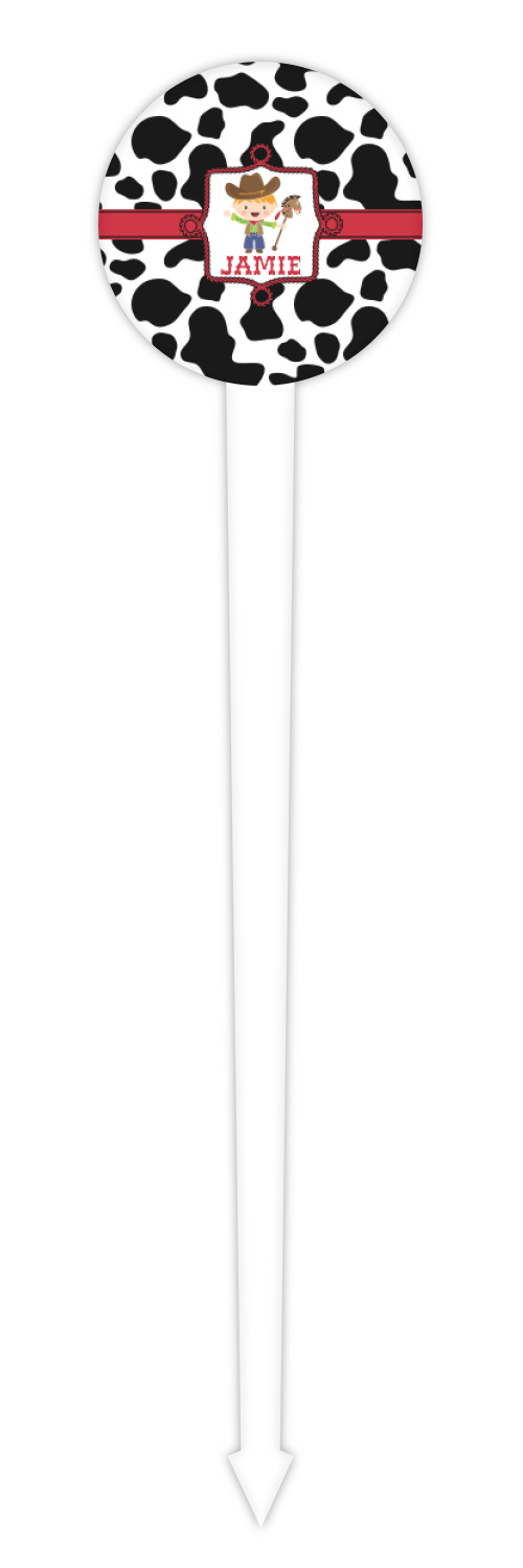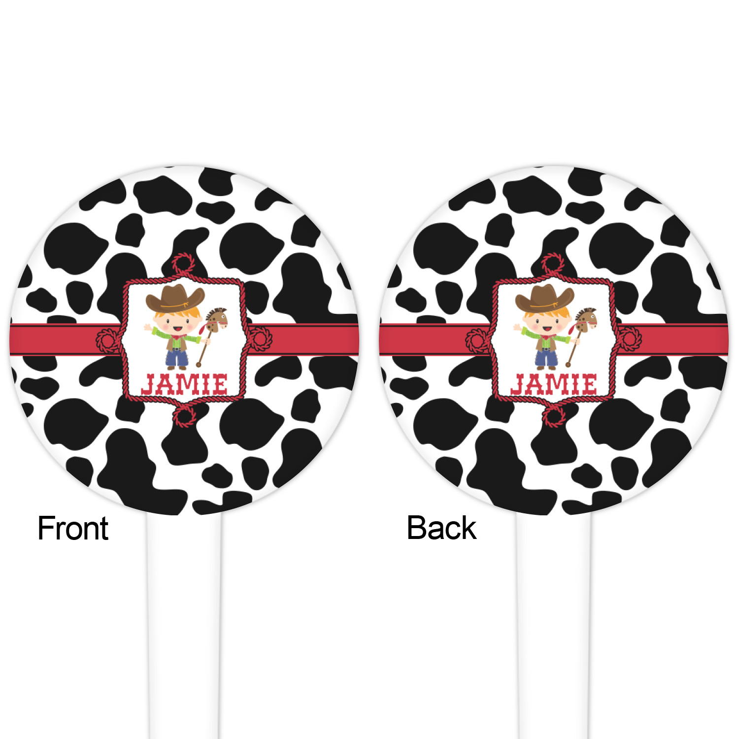 This western themed design is perfect for a cowboy or cowgirl. The background is cow print, with a red ribbon in the center. The label is made of rope and you can customize it by choosing a cowgirl or a cowboy.