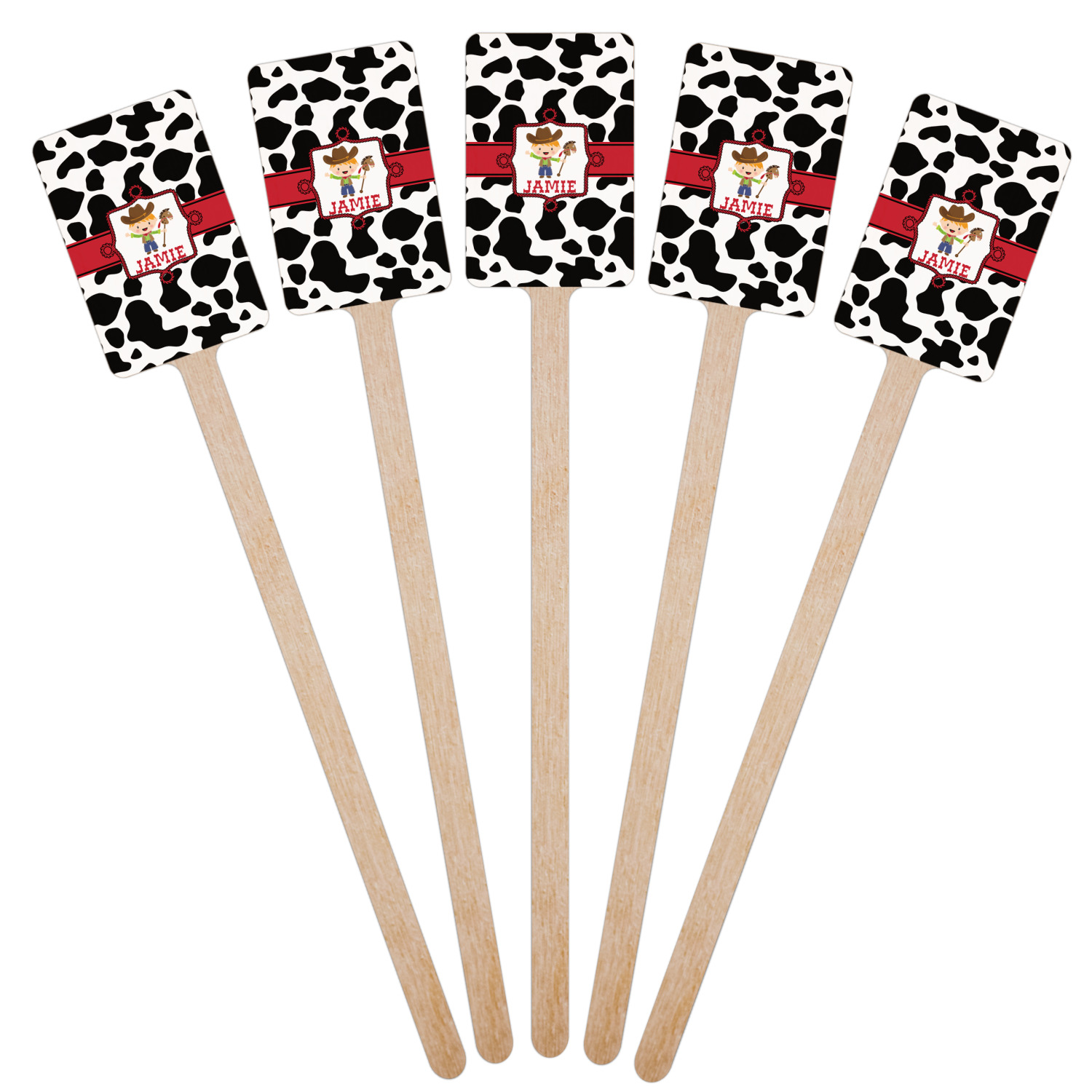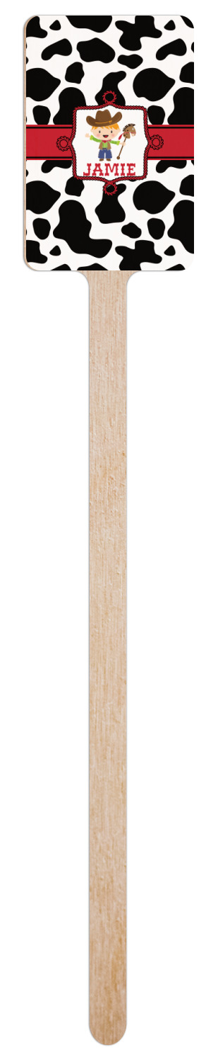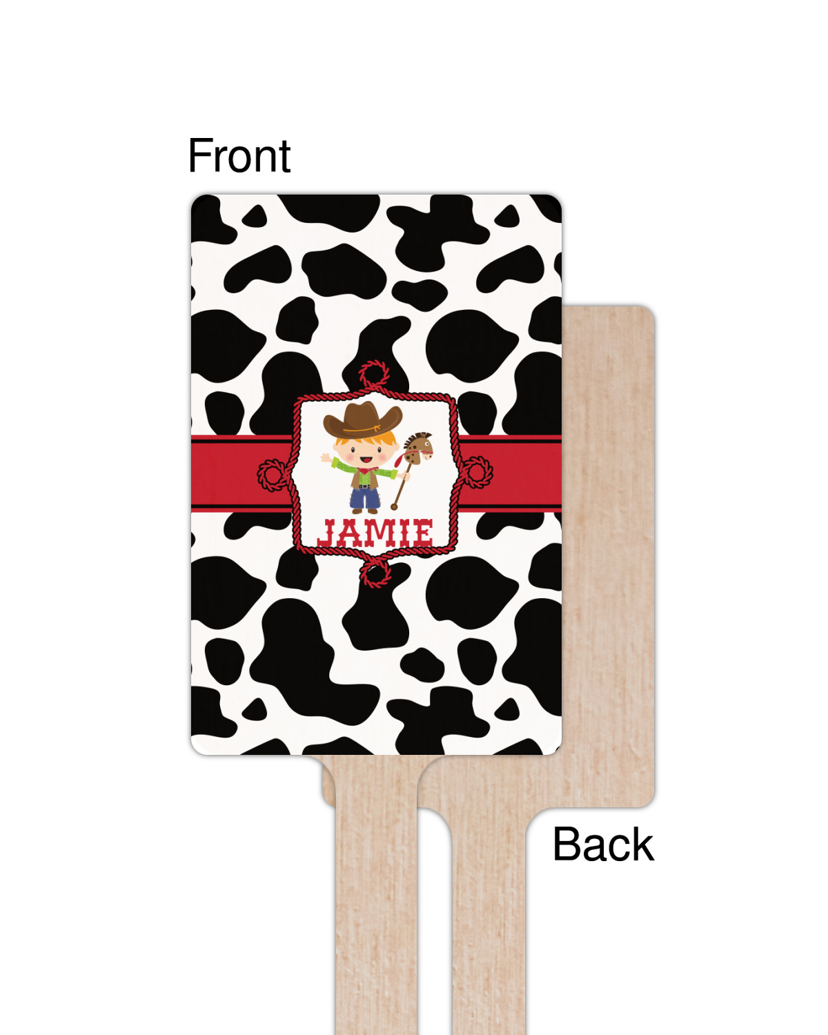 This western themed design is perfect for a cowboy or cowgirl. The background is cow print, with a red ribbon in the center. The label is made of rope and you can customize it by choosing a cowgirl or a cowboy.