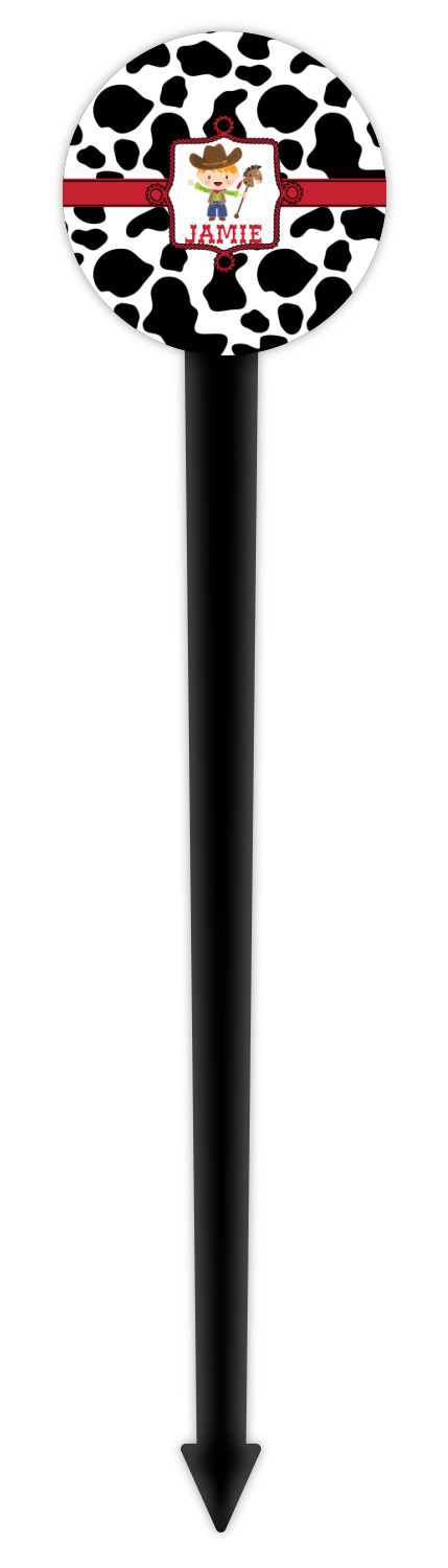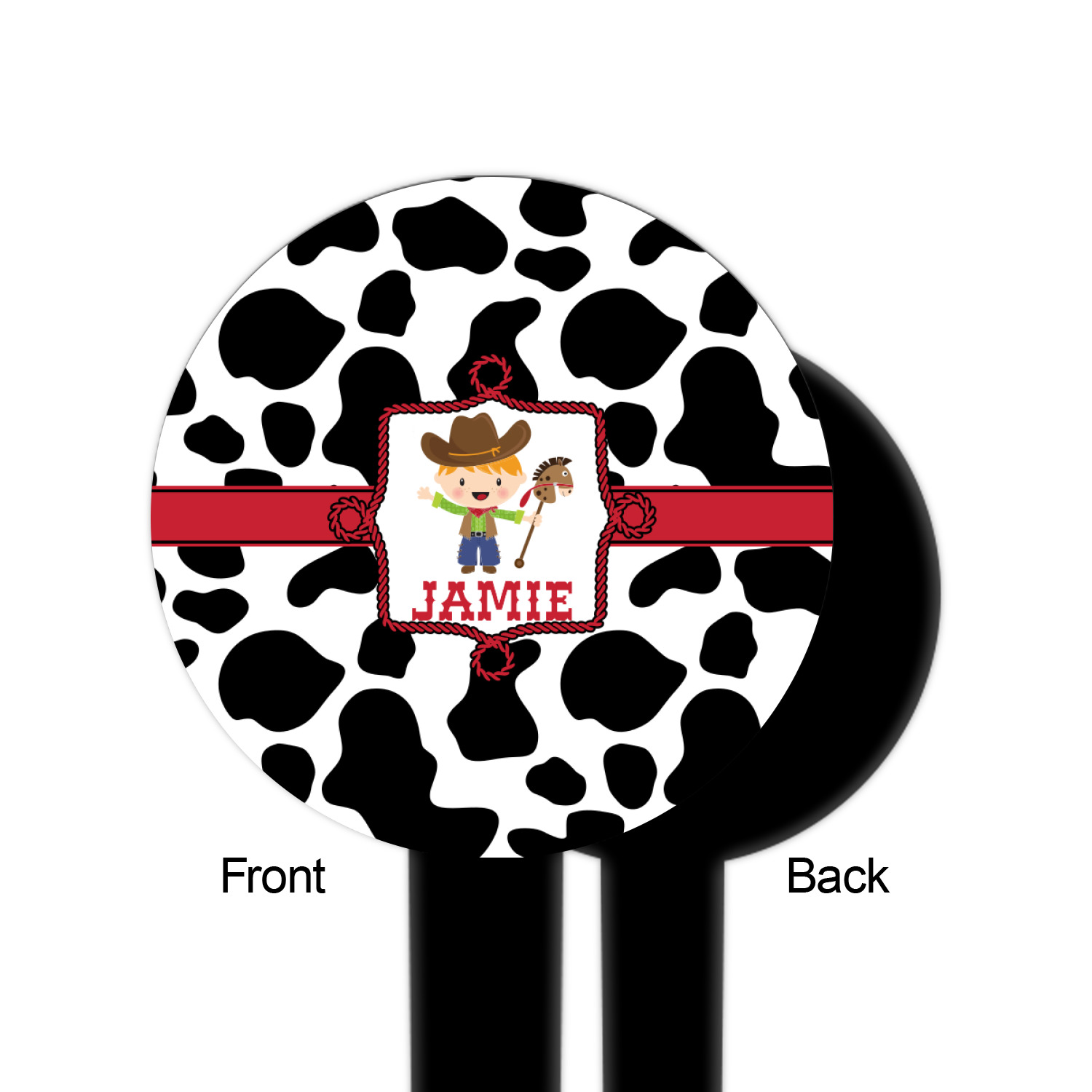 This western themed design is perfect for a cowboy or cowgirl. The background is cow print, with a red ribbon in the center. The label is made of rope and you can customize it by choosing a cowgirl or a cowboy.
