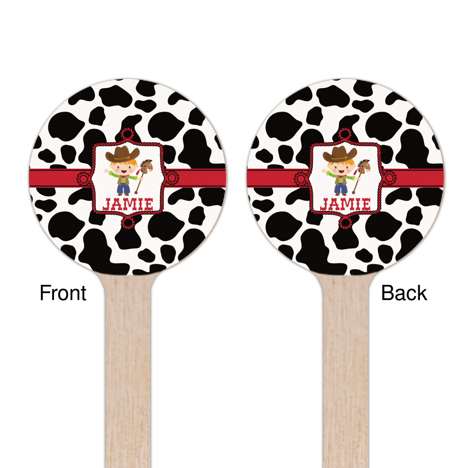 This western themed design is perfect for a cowboy or cowgirl. The background is cow print, with a red ribbon in the center. The label is made of rope and you can customize it by choosing a cowgirl or a cowboy.