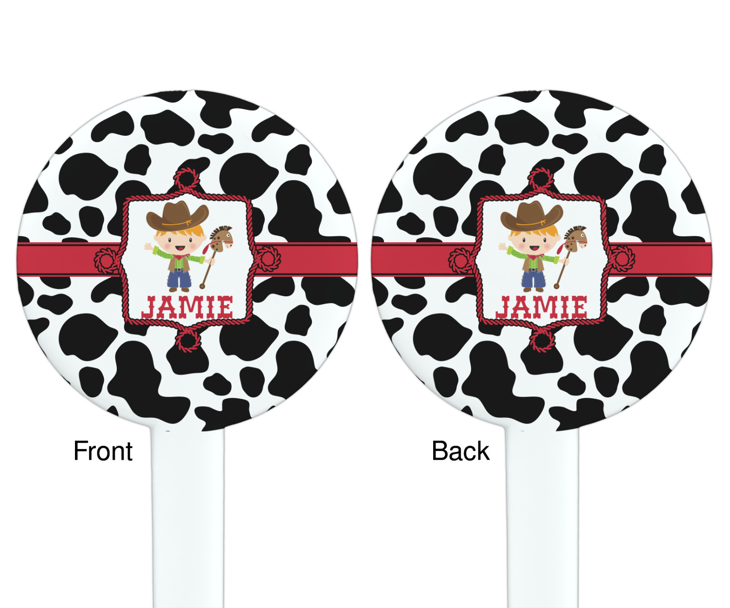 This western themed design is perfect for a cowboy or cowgirl. The background is cow print, with a red ribbon in the center. The label is made of rope and you can customize it by choosing a cowgirl or a cowboy.