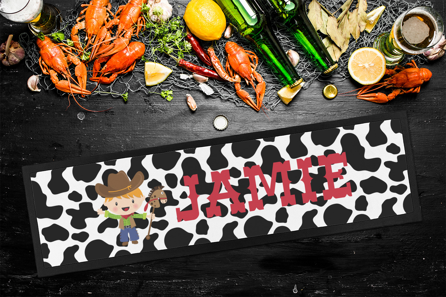 This western themed design is perfect for a cowboy or cowgirl. The background is cow print, with a red ribbon in the center. The label is made of rope and you can customize it by choosing a cowgirl or a cowboy.