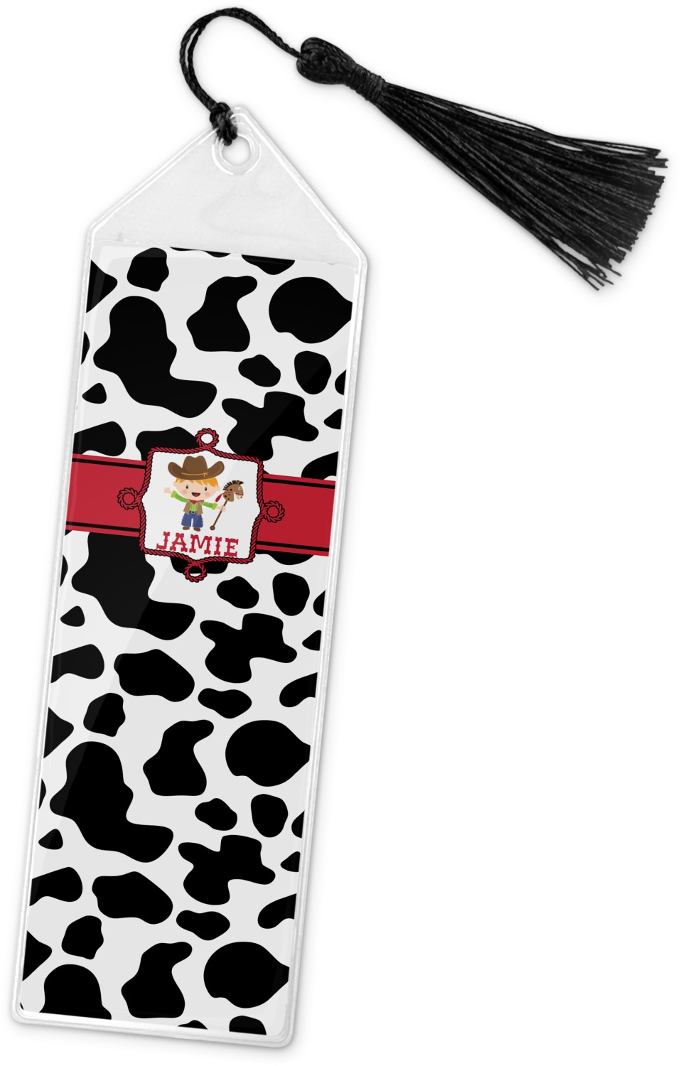 Your personalized bookmark is made of a sturdy, clear vinyl, and is approximately 7.5" x 2.25". We display your personalization on vinyl inserts that are placed on both sides. Accompanying each book marker is a black, fringe tassel that attaches to the reinforced, triangular header.