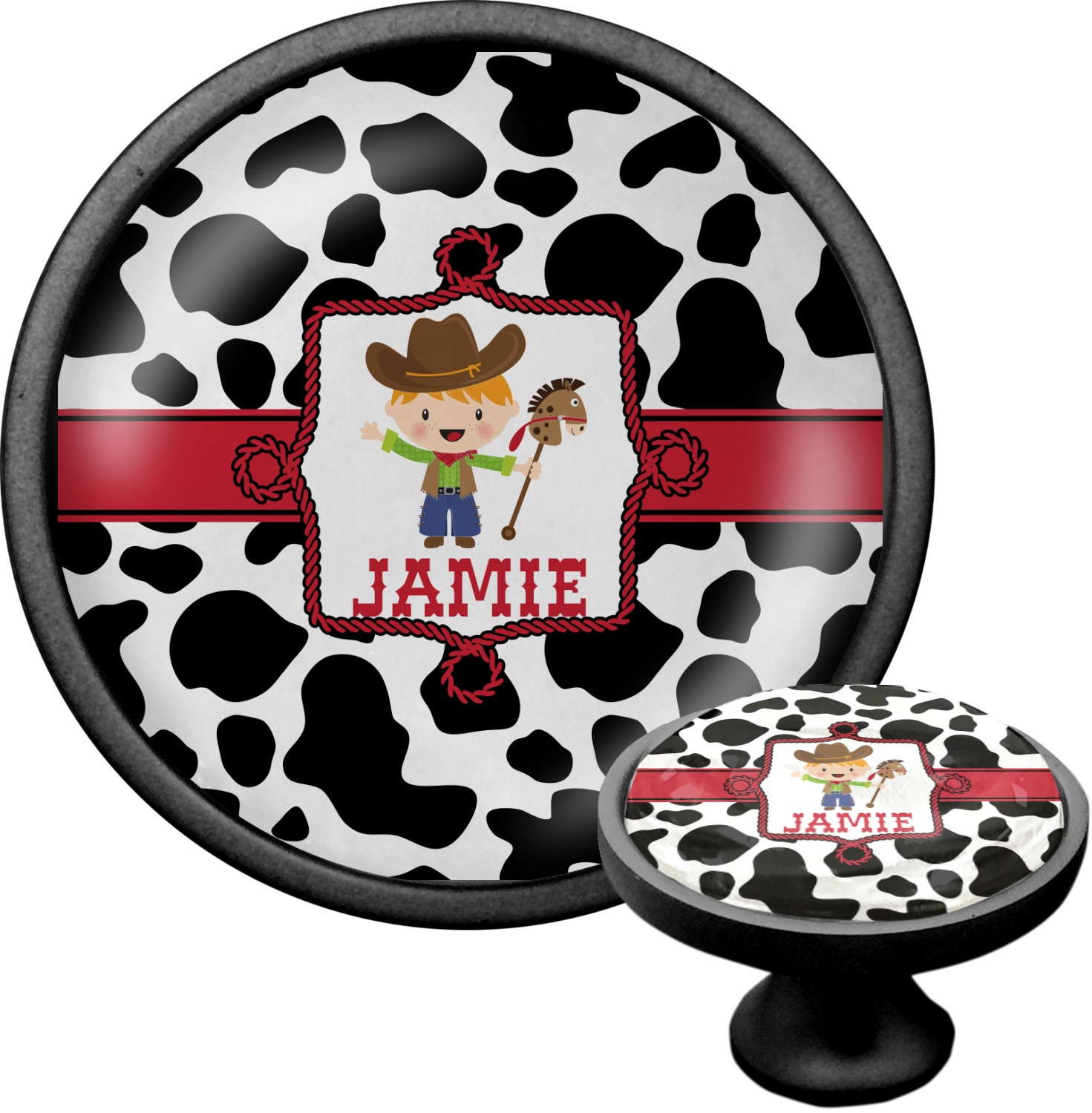 This western themed design is perfect for a cowboy or cowgirl. The background is cow print, with a red ribbon in the center. The label is made of rope and you can customize it by choosing a cowgirl or a cowboy.