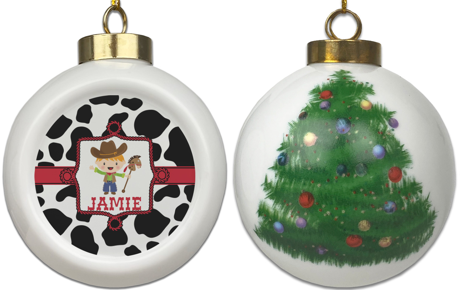 Our Christmas ornaments are a unique ceramic ball shape with a twist as it has a flat face to display your custom design! Select from one of our two design types - Christmas Tree or Poinsettia Garland - to adorn the curved back of your personal design. Each ornament measures 3H x 2.5W x 2D accompanied with a gold string accent for finishing touches to hang on your beautiful Christmas tree!