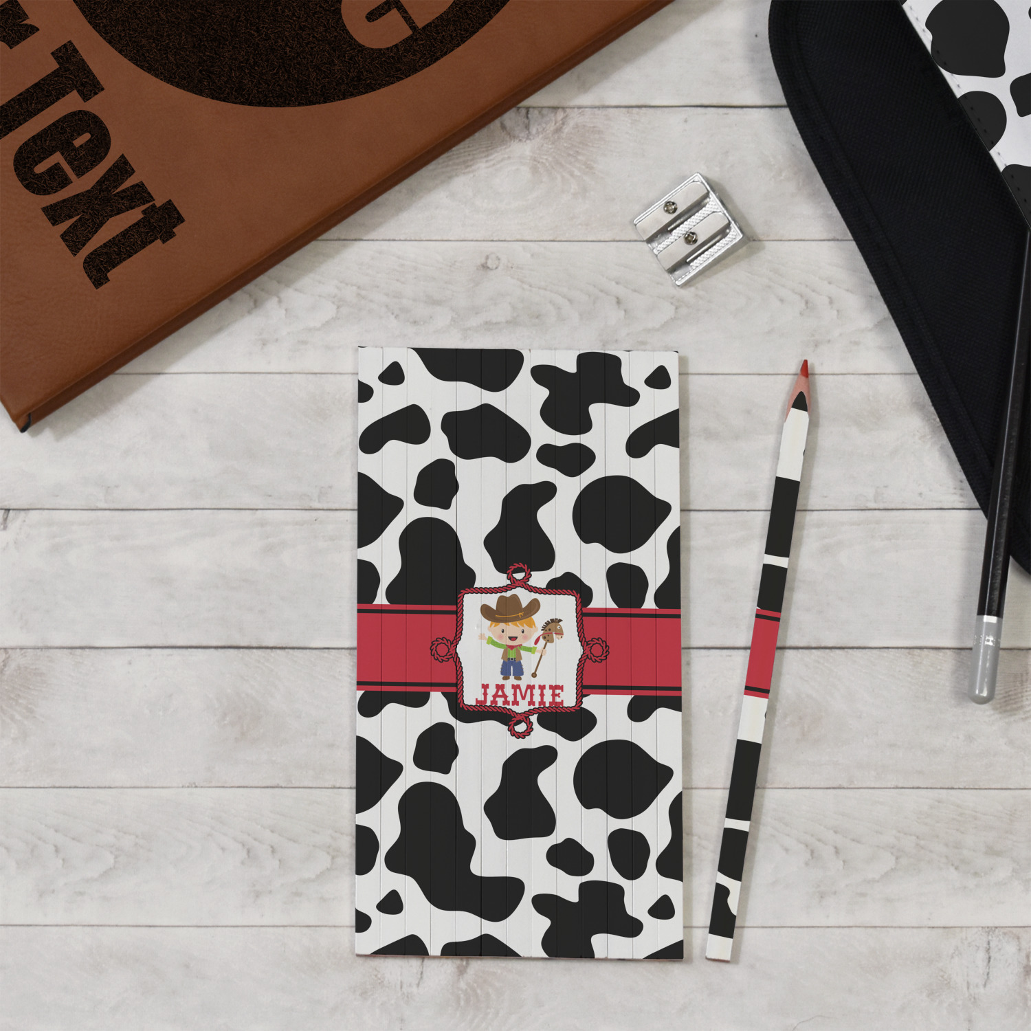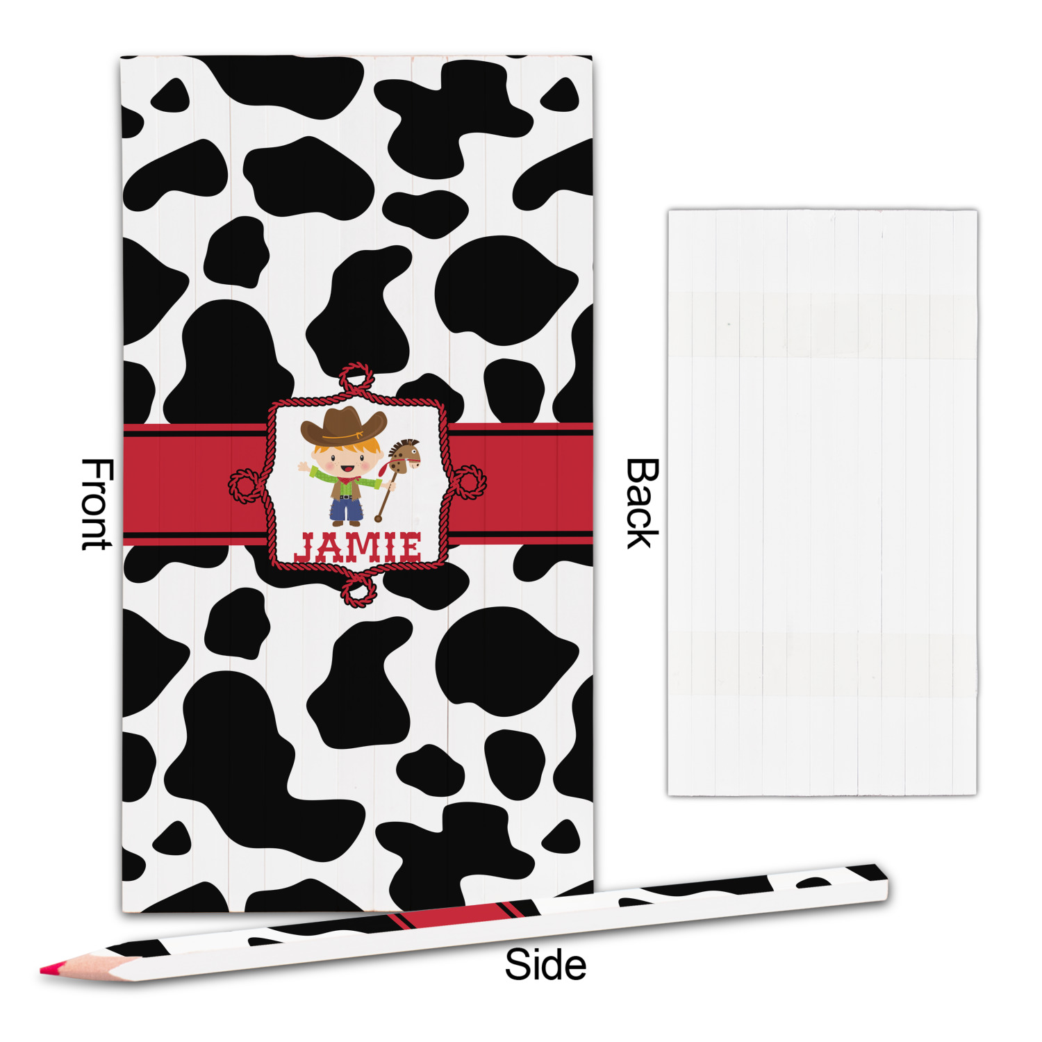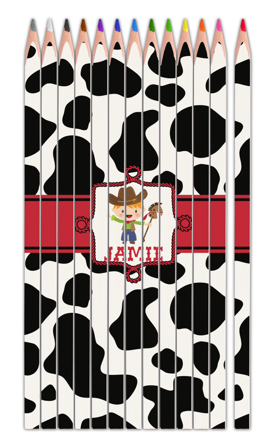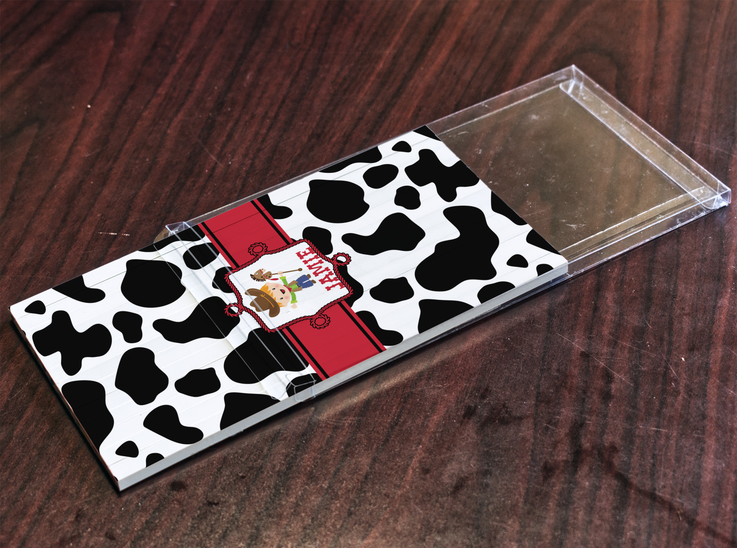 This western themed design is perfect for a cowboy or cowgirl. The background is cow print, with a red ribbon in the center. The label is made of rope and you can customize it by choosing a cowgirl or a cowboy.