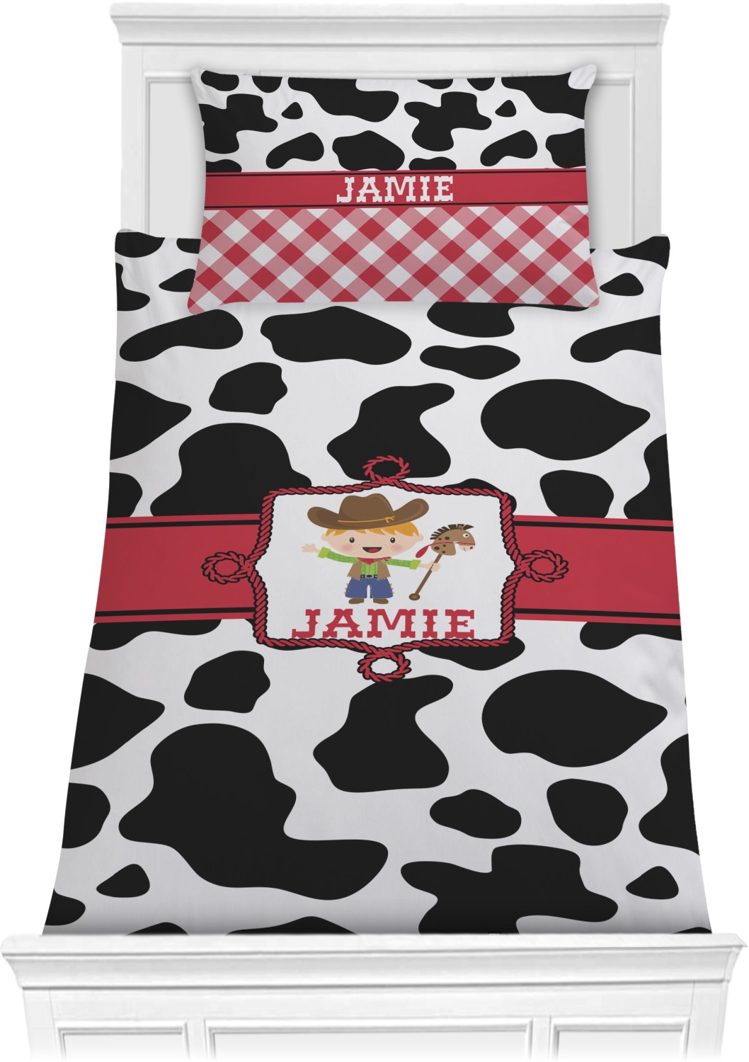 This western themed design is perfect for a cowboy or cowgirl. The background is cow print, with a red ribbon in the center. The label is made of rope and you can customize it by choosing a cowgirl or a cowboy.