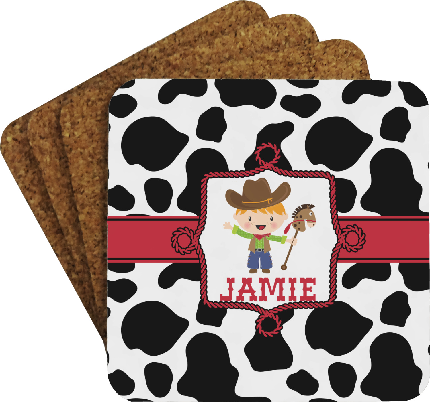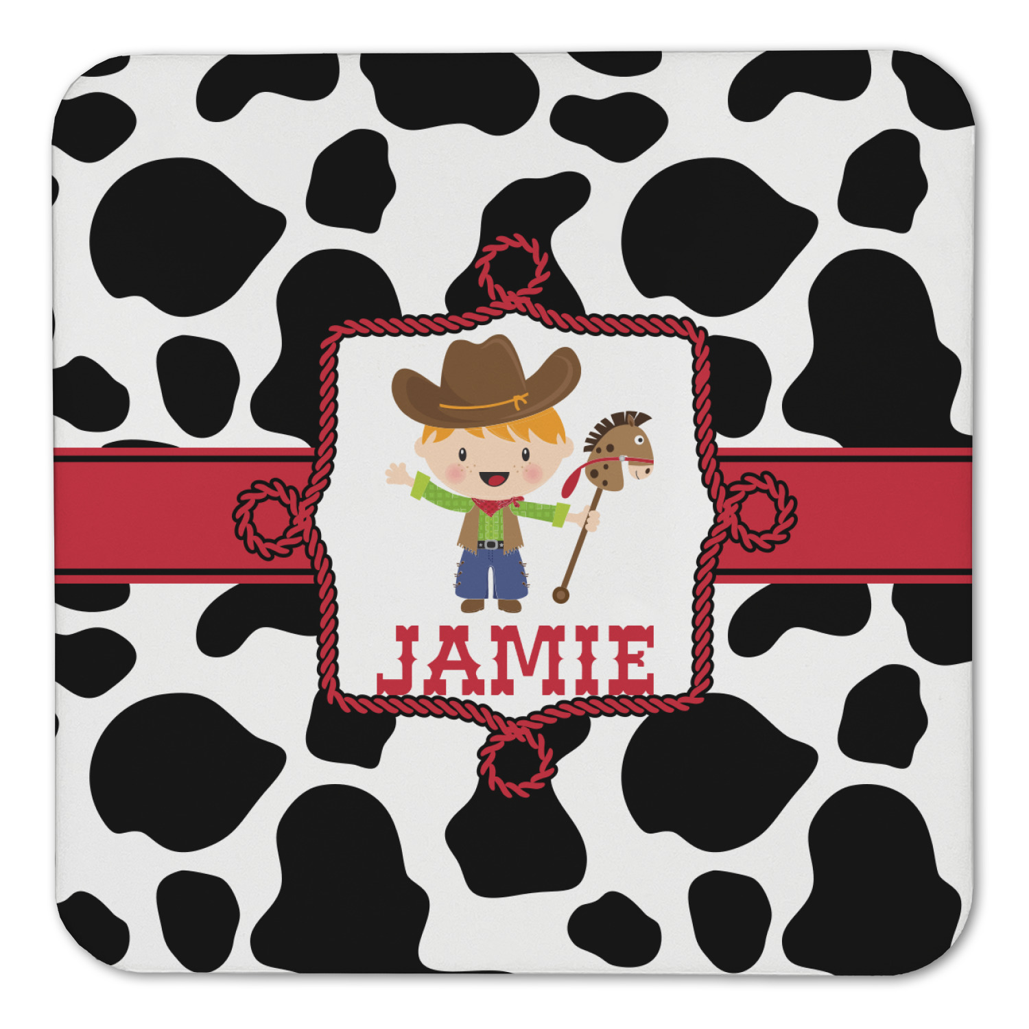 This western themed design is perfect for a cowboy or cowgirl. The background is cow print, with a red ribbon in the center. The label is made of rope and you can customize it by choosing a cowgirl or a cowboy.