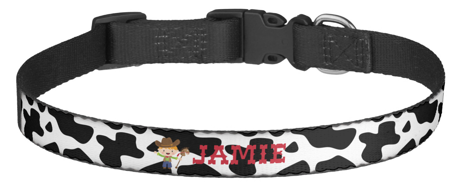 This sturdy collar, made from a durable nylon weave, will outlive your dog's episodes of excited tugging and pulling. Courtesy of its thick plastic buckle and adjuster, this collar is adjustable and accommodating of any dog. Structurally, the collar is a single piece of nylon weave that is sewn together, and features a solid metal loop where you can attach a leash or dog tag. We print and display your dog's name and pattern across the middle of the personalized dog collar.
