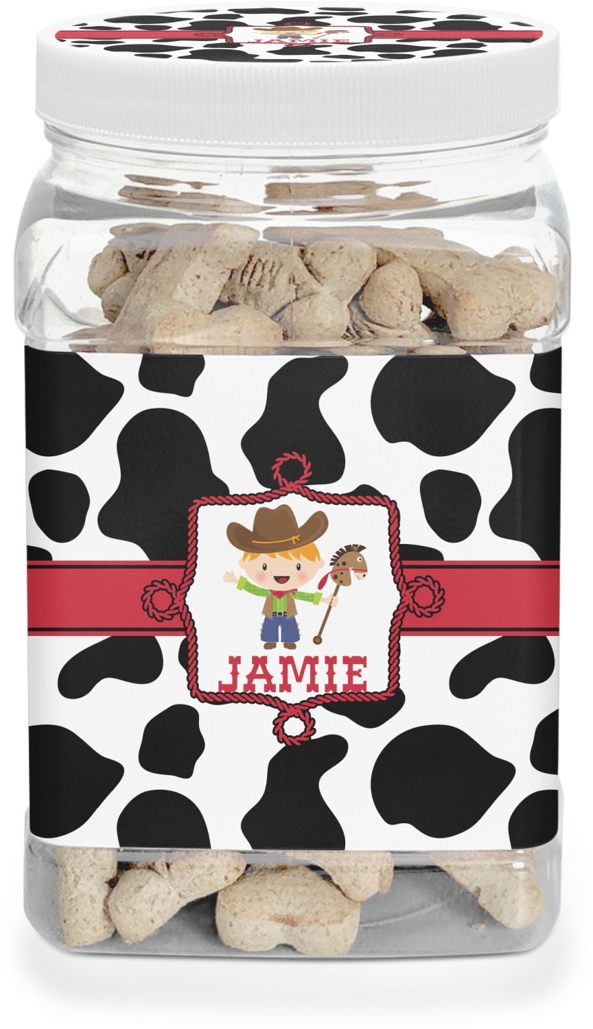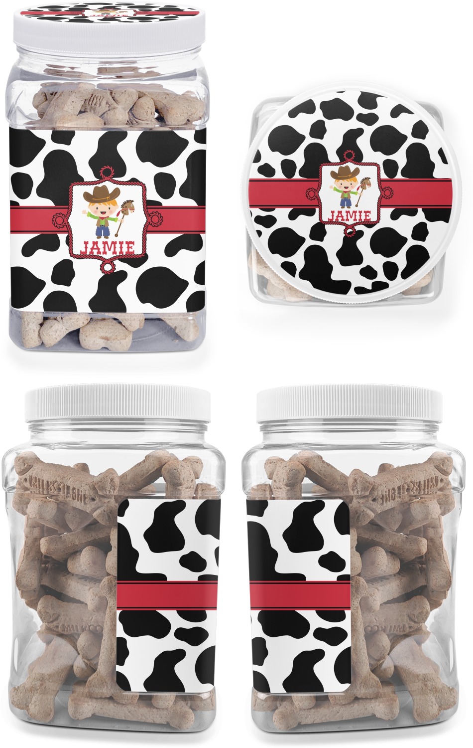 This half gallon jar, made from a sturdy plastic, is the perfect way to keep treats from any naughty pet paws, while still keeping them ready on hand for when your pup performs an impressive trick. This dog cookie jar features a screw-on, white lid that displays your personalized design on a vinyl sticker. We apply another customized sticker that wraps around the front and sides of the jar. Our dog treat jar also has indentations on the rear ends of the sides, which allows for convenient handling, and its square frame allows for easy storage.