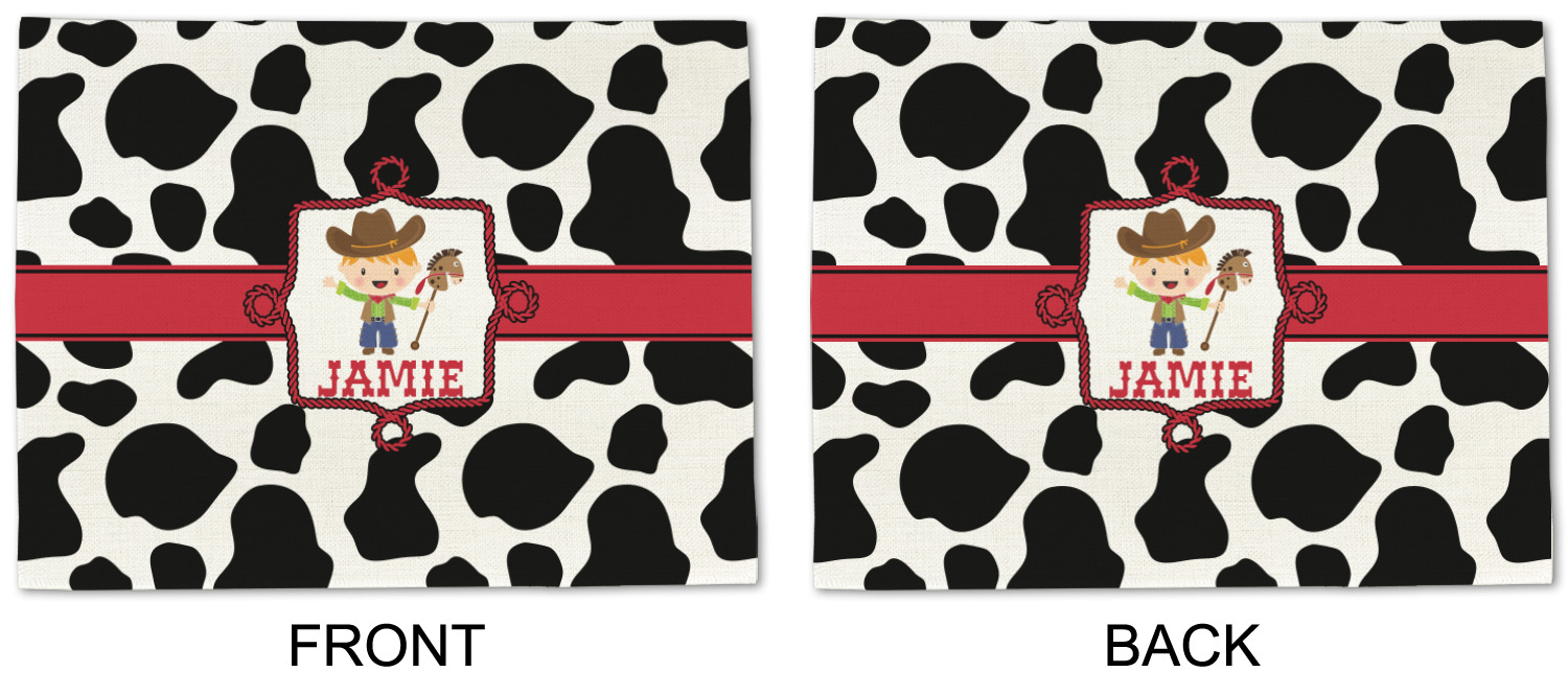 This western themed design is perfect for a cowboy or cowgirl. The background is cow print, with a red ribbon in the center. The label is made of rope and you can customize it by choosing a cowgirl or a cowboy.