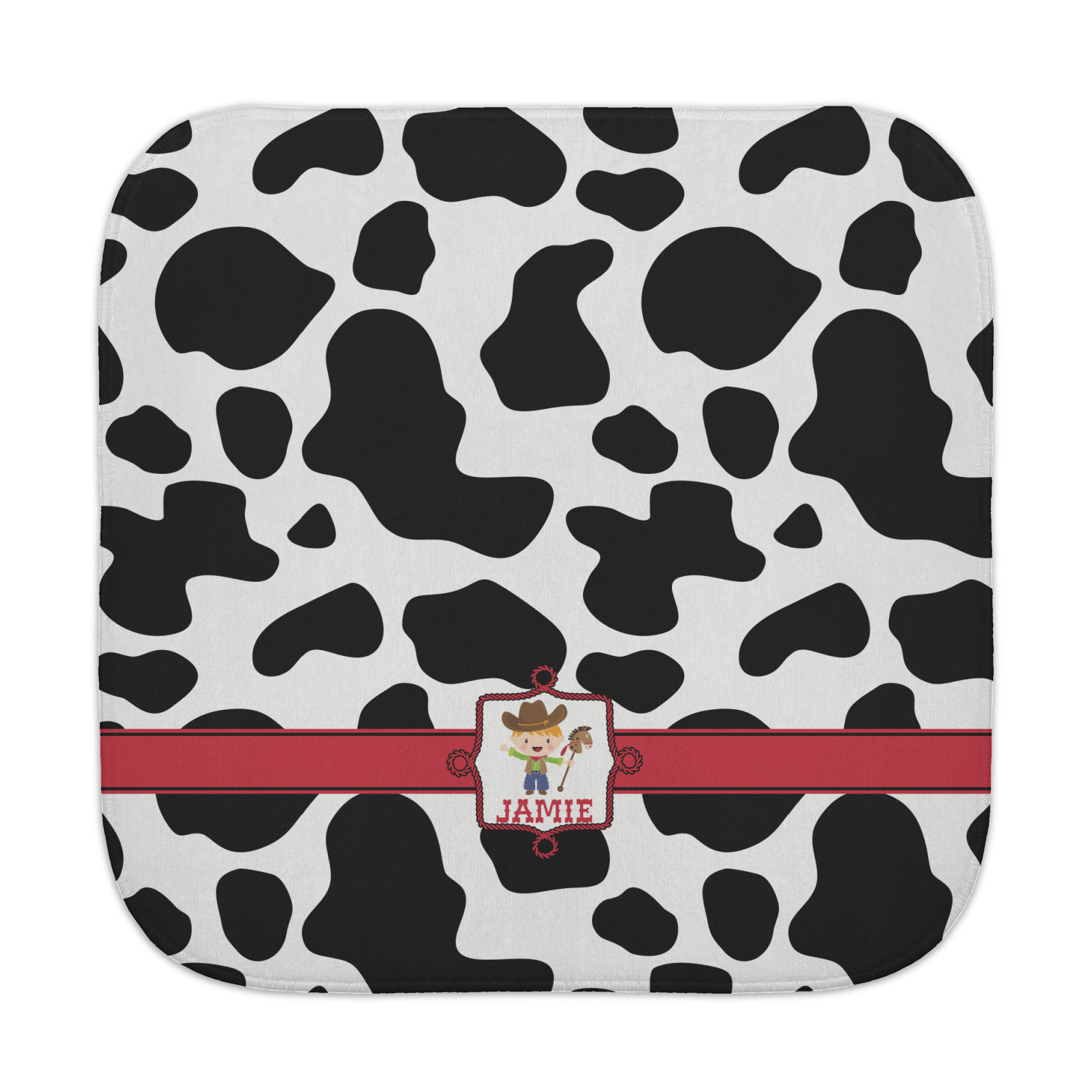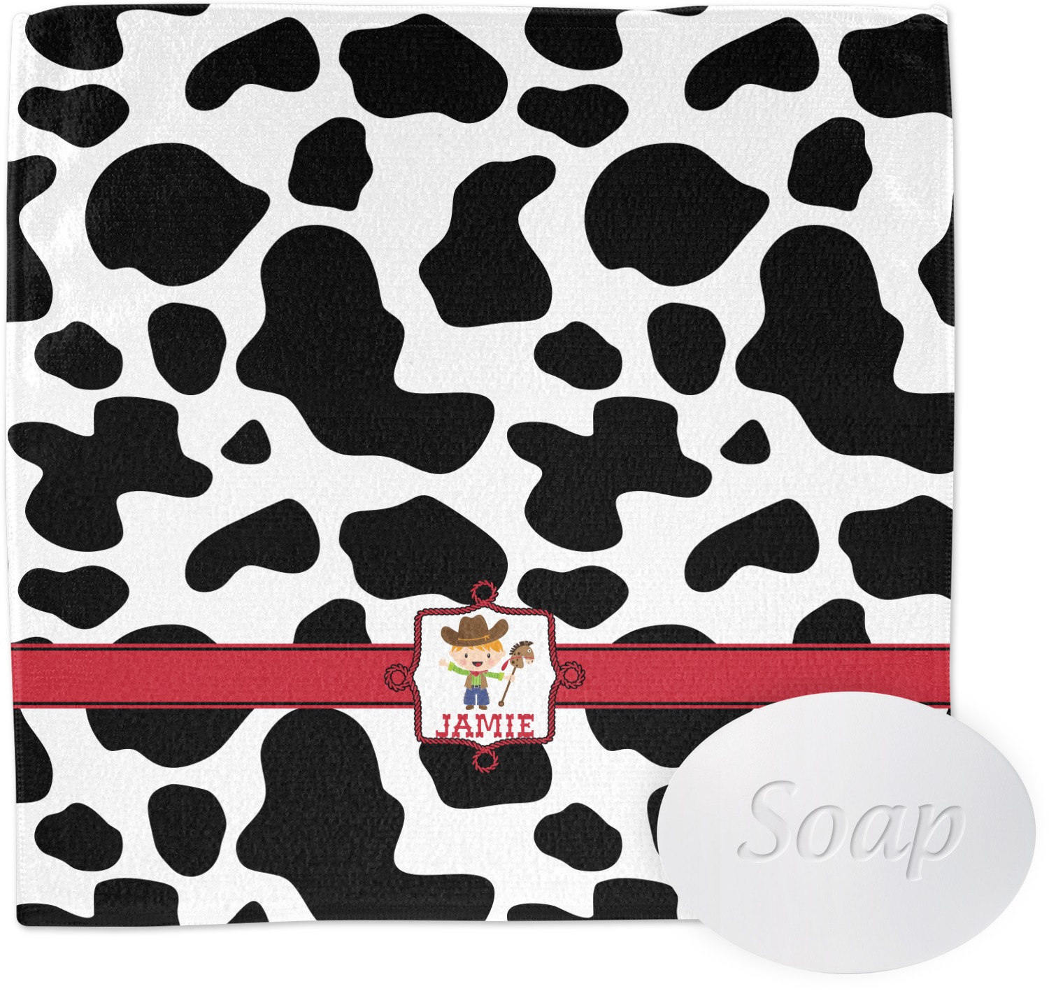 This western themed design is perfect for a cowboy or cowgirl. The background is cow print, with a red ribbon in the center. The label is made of rope and you can customize it by choosing a cowgirl or a cowboy.