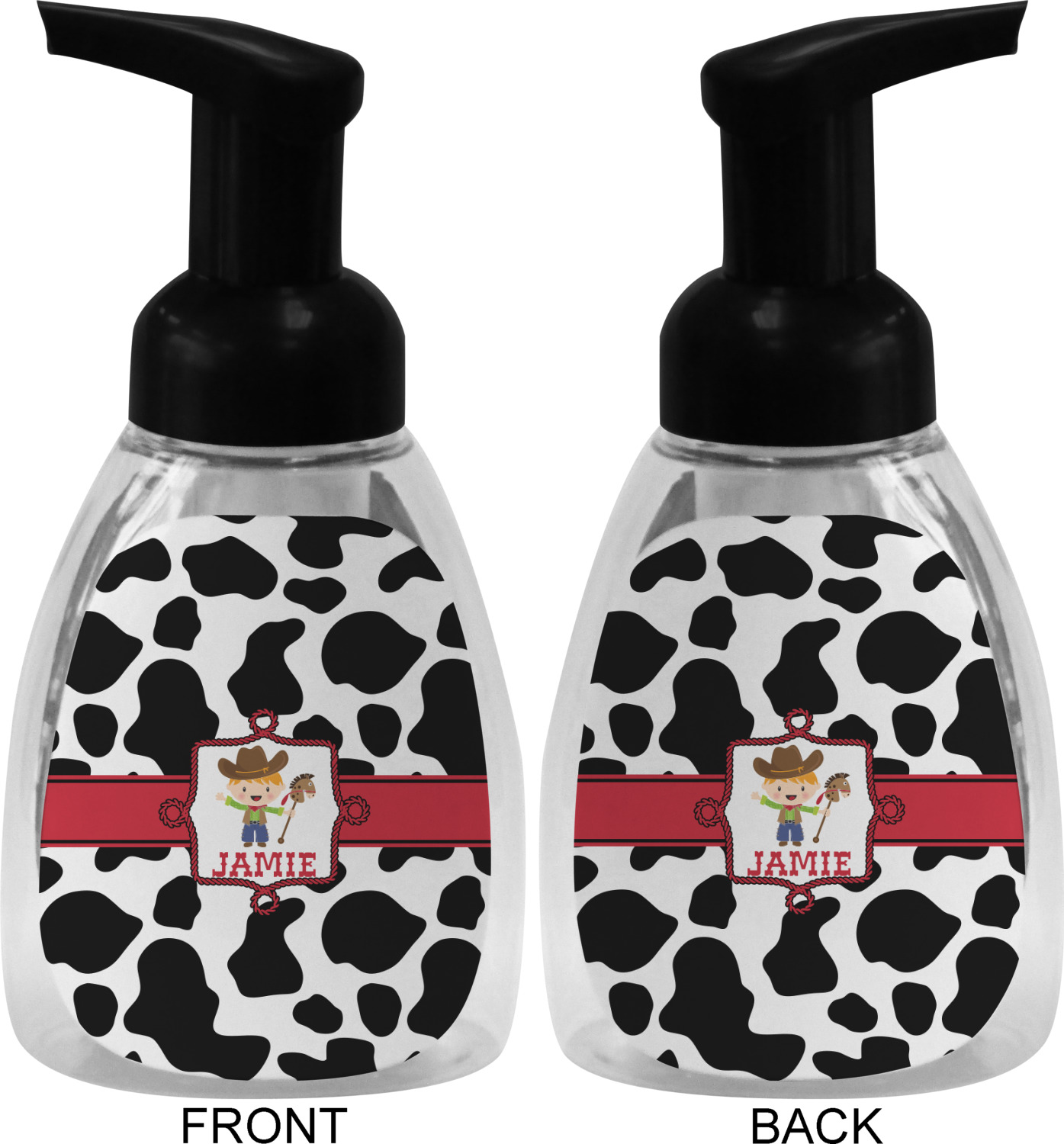 This soap dispenser is made of a robust plastic and has a clear base. The included soap pump is available in black or white color. This dispenser is 6.5 inches tall, 3 inches wide, and 2 inches deep. We display your customized designs on the front and back sides of these foaming hand soap dispensers.