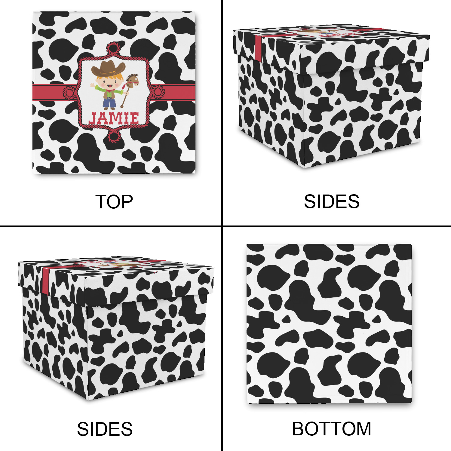 This western themed design is perfect for a cowboy or cowgirl. The background is cow print, with a red ribbon in the center. The label is made of rope and you can customize it by choosing a cowgirl or a cowboy.