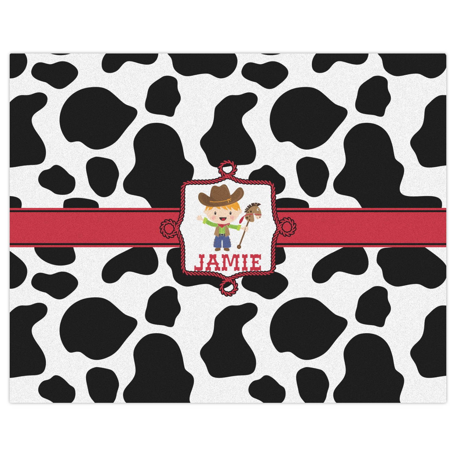 This western themed design is perfect for a cowboy or cowgirl. The background is cow print, with a red ribbon in the center. The label is made of rope and you can customize it by choosing a cowgirl or a cowboy.