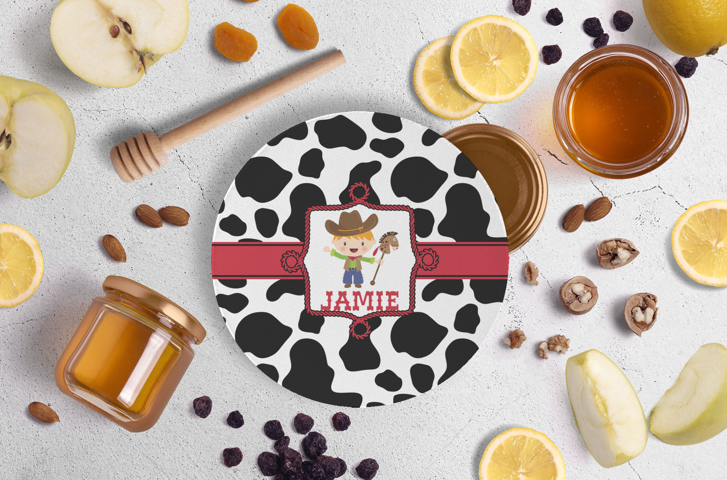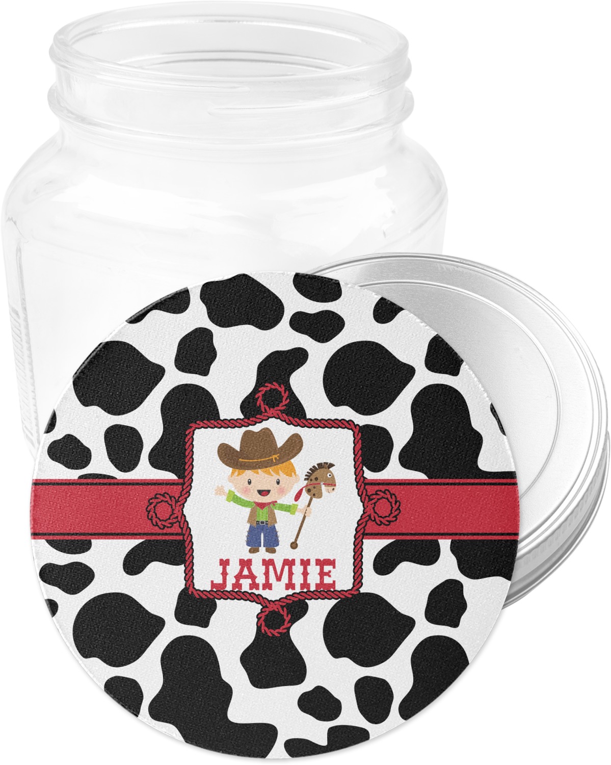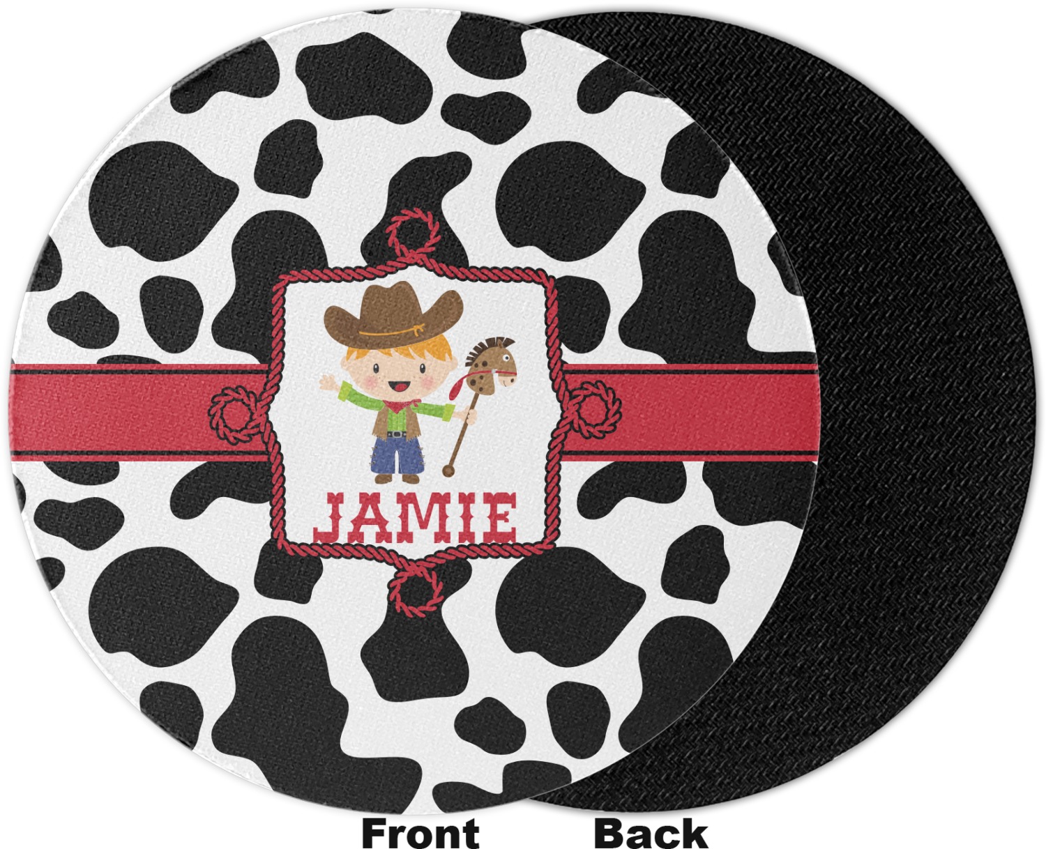 This western themed design is perfect for a cowboy or cowgirl. The background is cow print, with a red ribbon in the center. The label is made of rope and you can customize it by choosing a cowgirl or a cowboy.