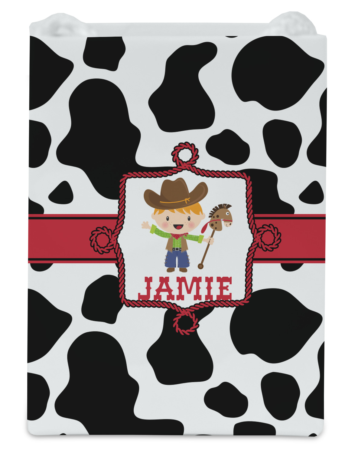 This western themed design is perfect for a cowboy or cowgirl. The background is cow print, with a red ribbon in the center. The label is made of rope and you can customize it by choosing a cowgirl or a cowboy.