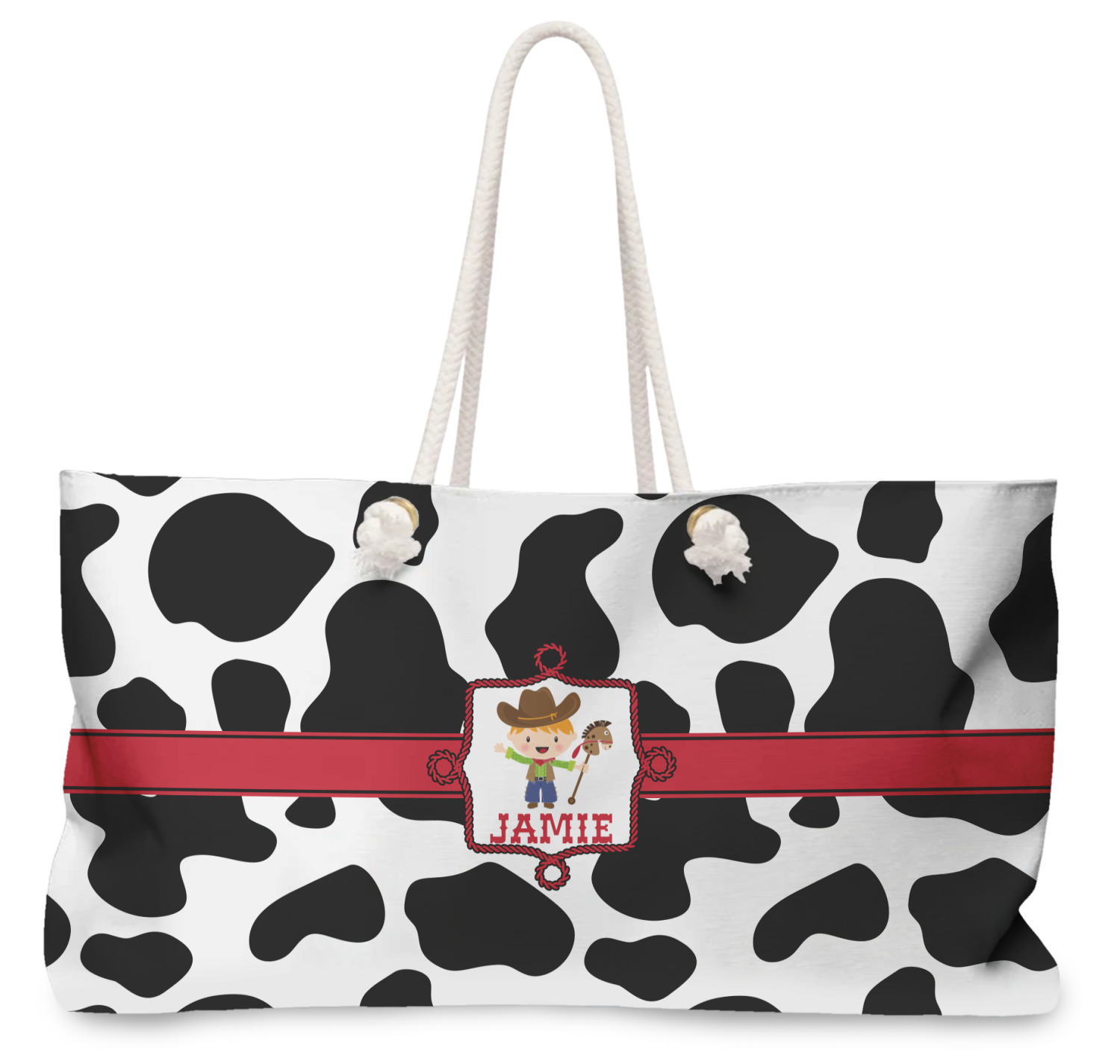 This western themed design is perfect for a cowboy or cowgirl. The background is cow print, with a red ribbon in the center. The label is made of rope and you can customize it by choosing a cowgirl or a cowboy.
