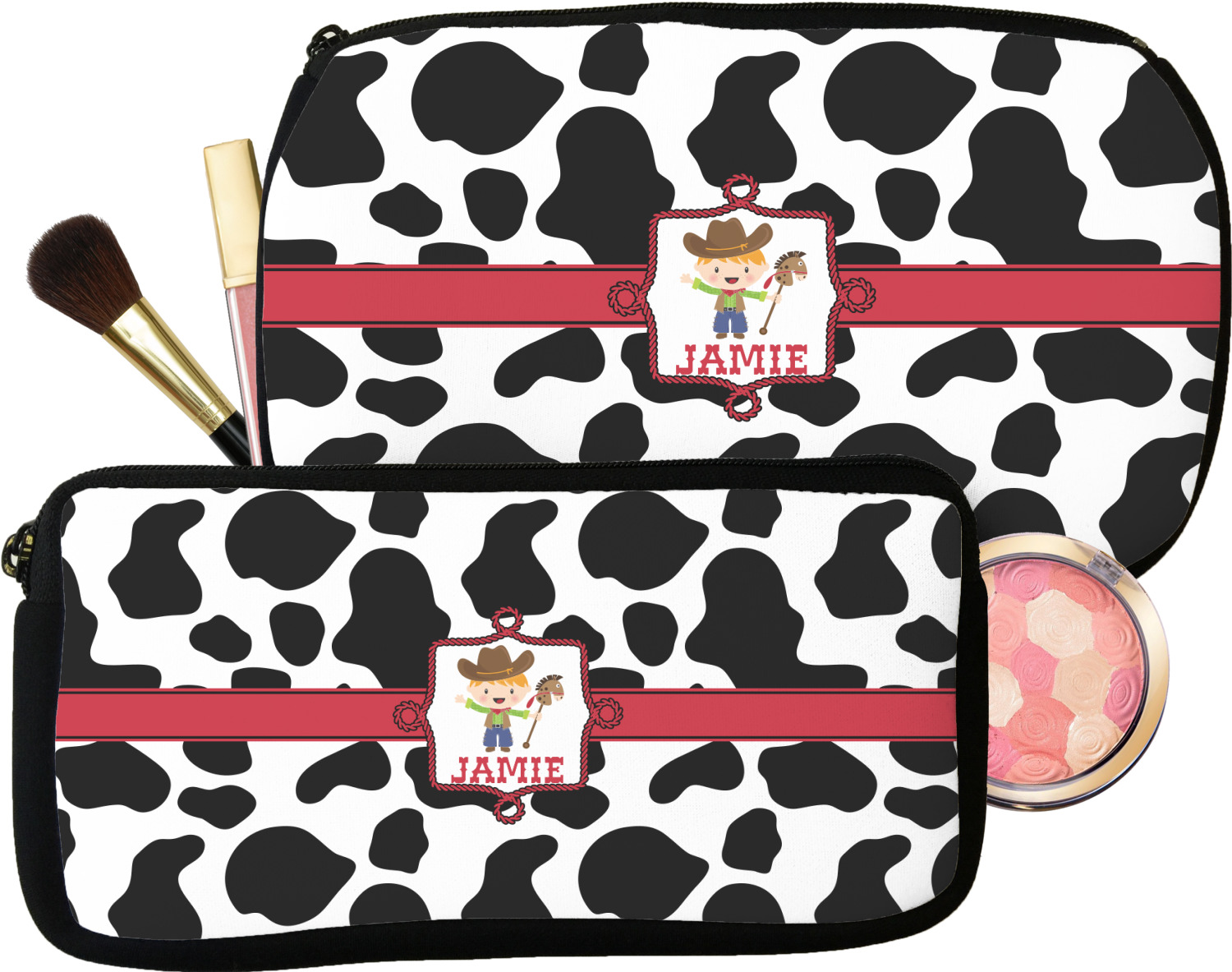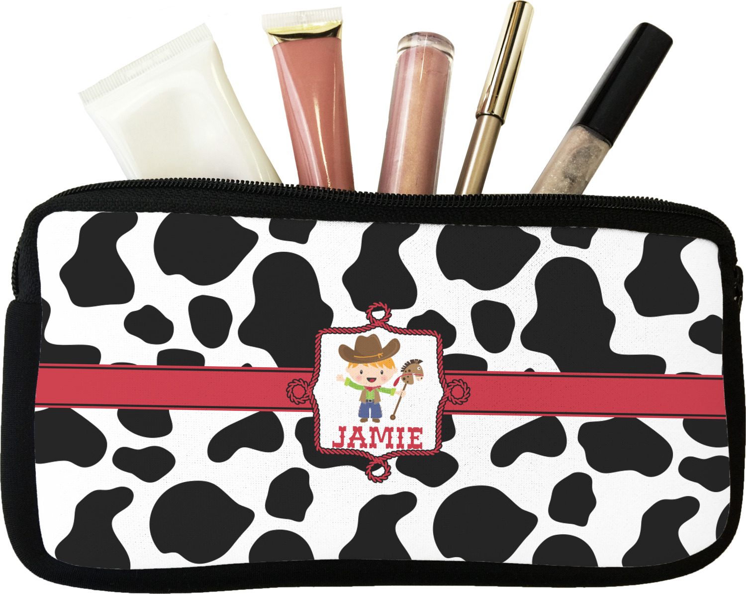 Our personalized makeup bags are available in many different designs, patterns and colors - so you are sure to find one that will love. They are made of neoprene (same material as wet-suits) and thus are water resistant, so spillages in your makeup bag will not end up all over you purse. They are customized on one side and are black on the other side and the zipper is black as well.