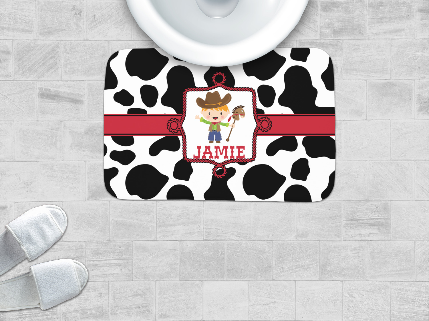This western themed design is perfect for a cowboy or cowgirl. The background is cow print, with a red ribbon in the center. The label is made of rope and you can customize it by choosing a cowgirl or a cowboy.