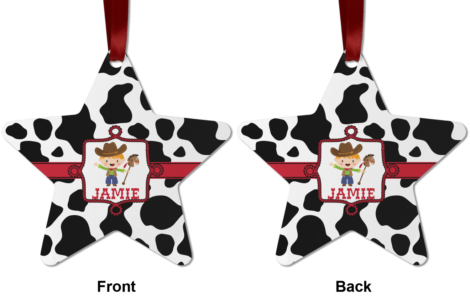 This western themed design is perfect for a cowboy or cowgirl. The background is cow print, with a red ribbon in the center. The label is made of rope and you can customize it by choosing a cowgirl or a cowboy.