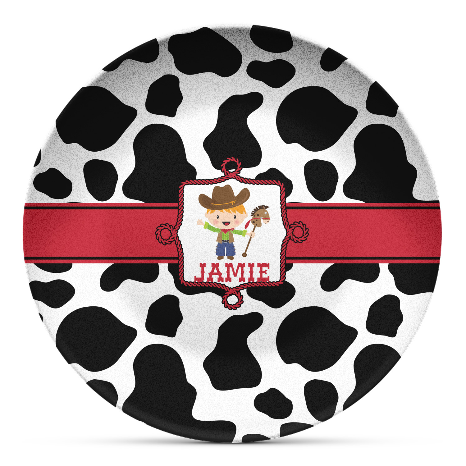 This western themed design is perfect for a cowboy or cowgirl. The background is cow print, with a red ribbon in the center. The label is made of rope and you can customize it by choosing a cowgirl or a cowboy.