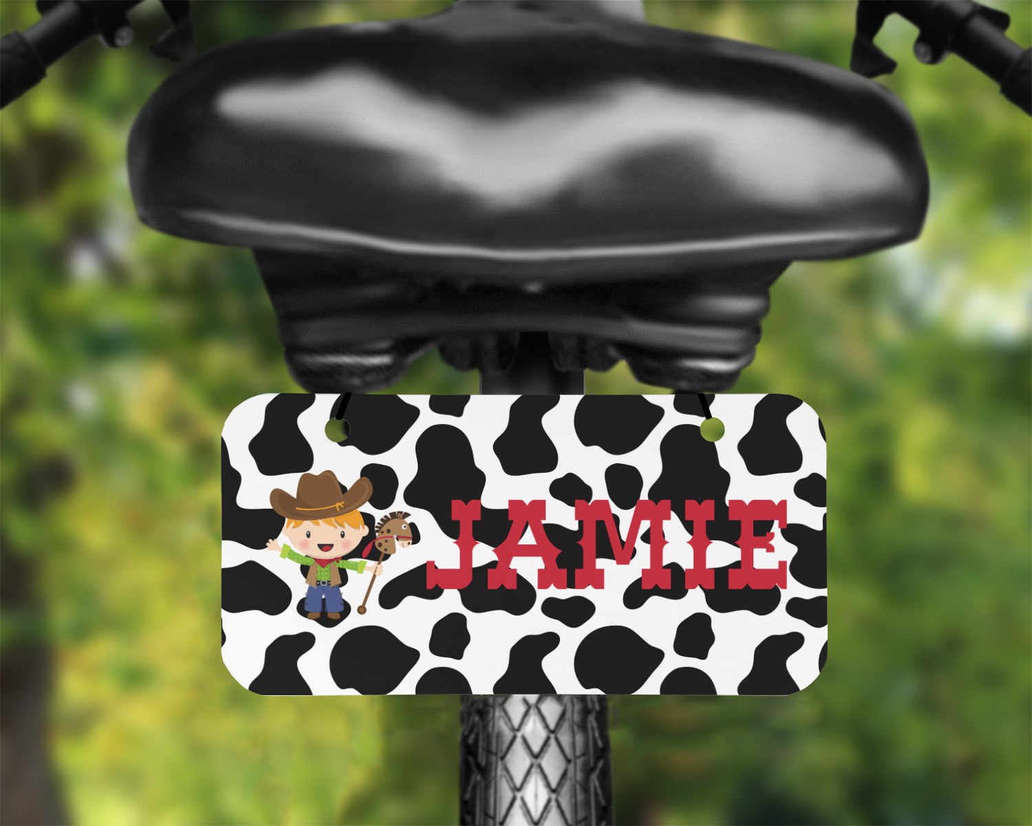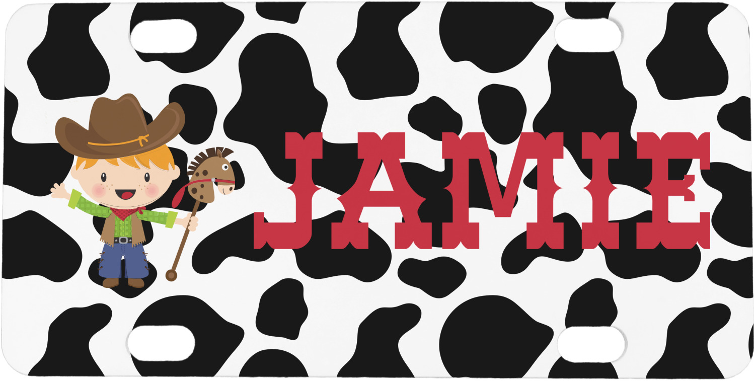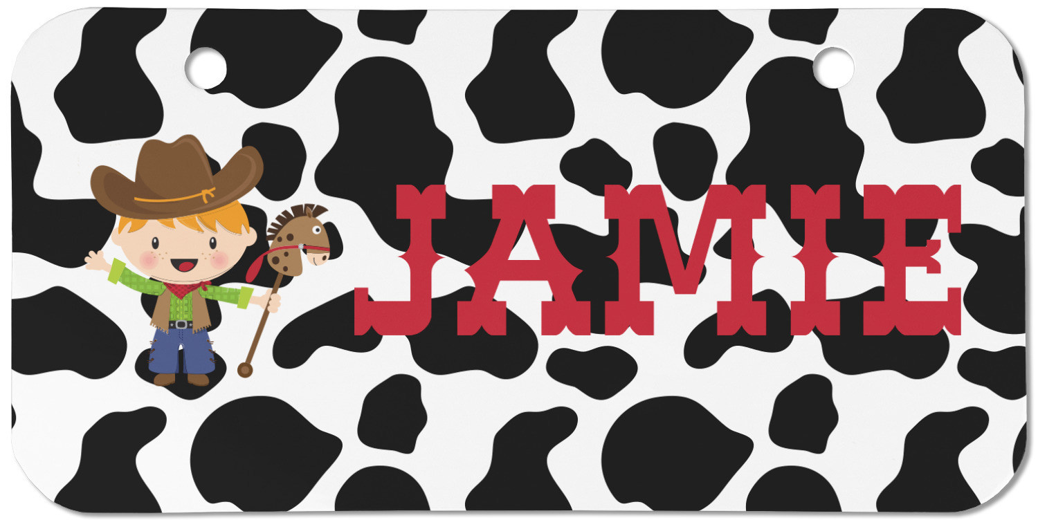 This western themed design is perfect for a cowboy or cowgirl. The background is cow print, with a red ribbon in the center. The label is made of rope and you can customize it by choosing a cowgirl or a cowboy.