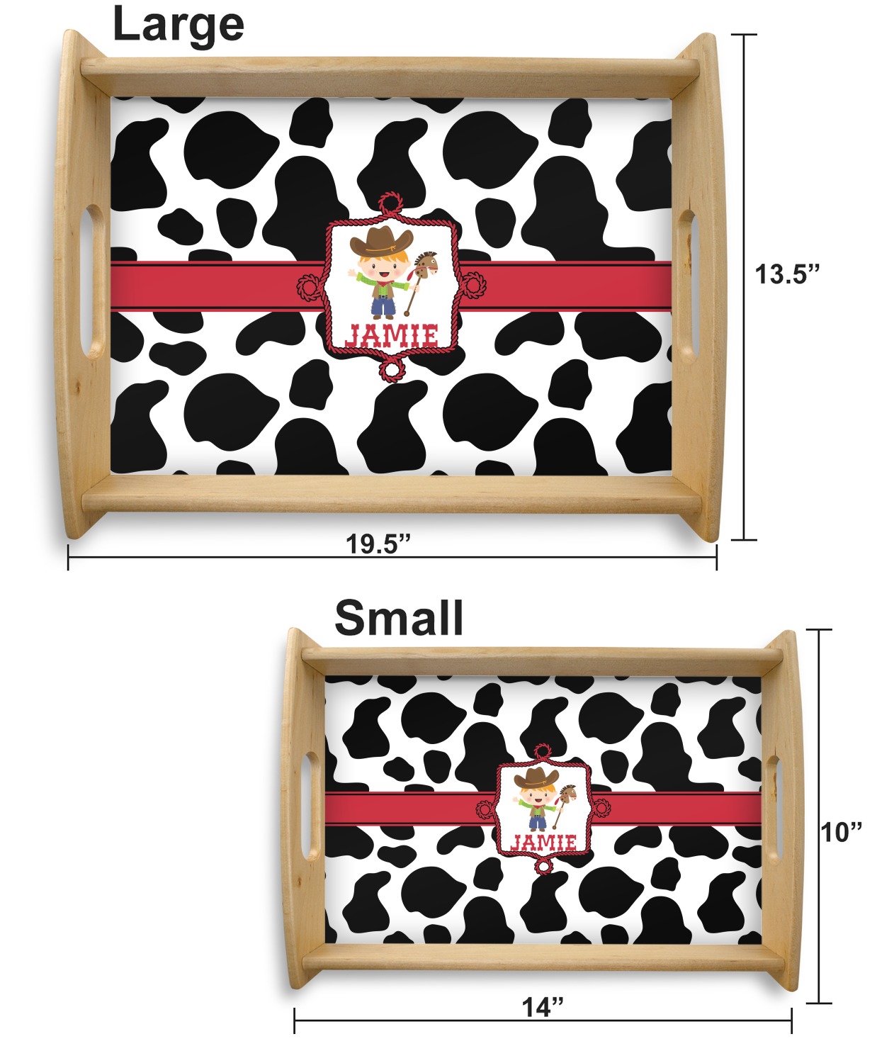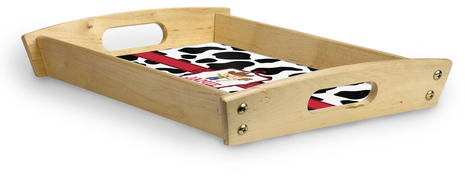 This serving tray with handles features square edges and two rounded sides, creating a very modern look. Each side is fabricated from a beautifully cut, natural wood. The bottom of the interior of the tray displays your customized design in bright, vibrant color. The tray is sold in both a black color and a natural wood look. Each variation of the wood serving tray has two sizes: Small, which is 14" x 10" x 2.25", and Large, which is 19.5" x 13.5" x 2.75".
