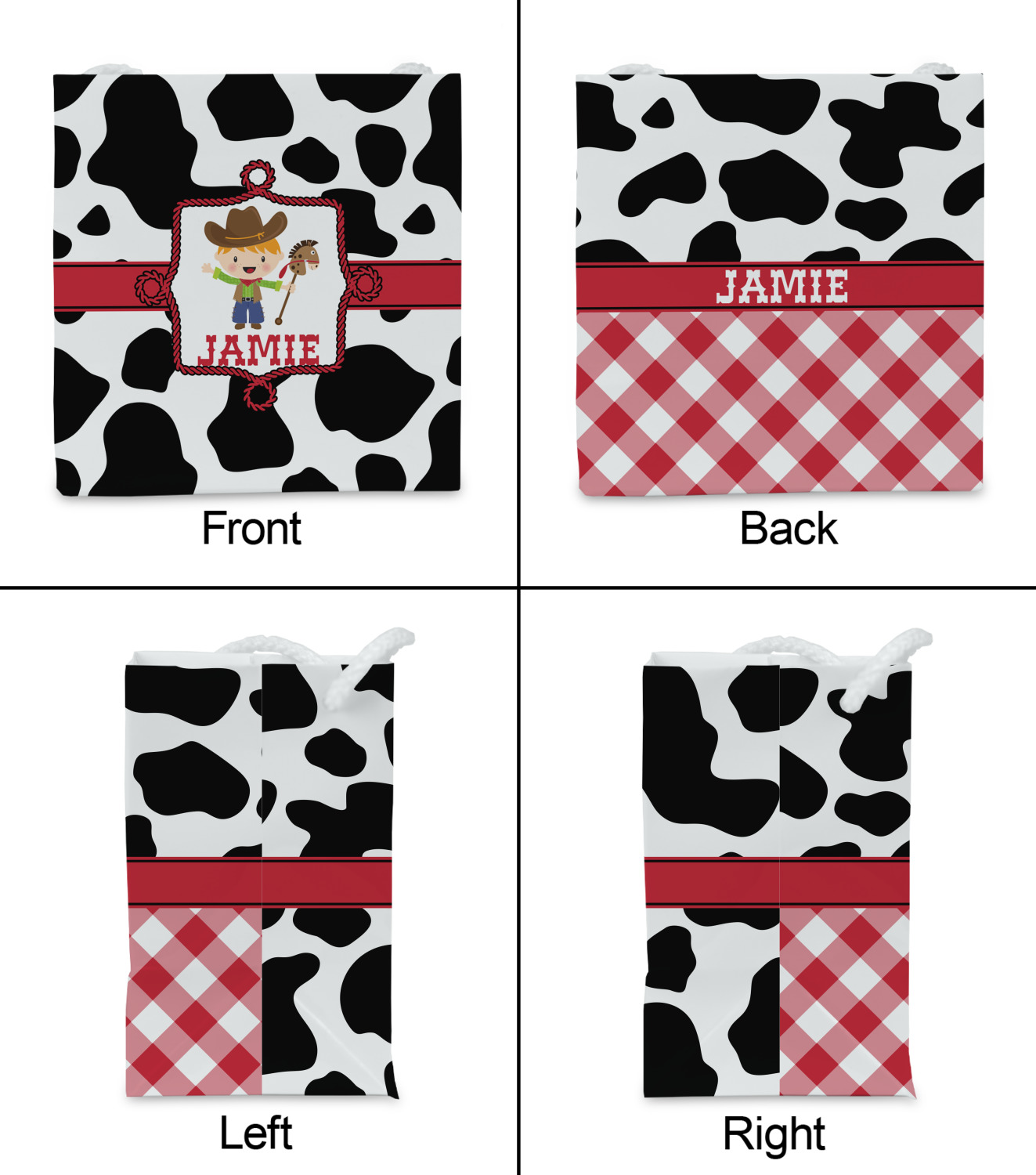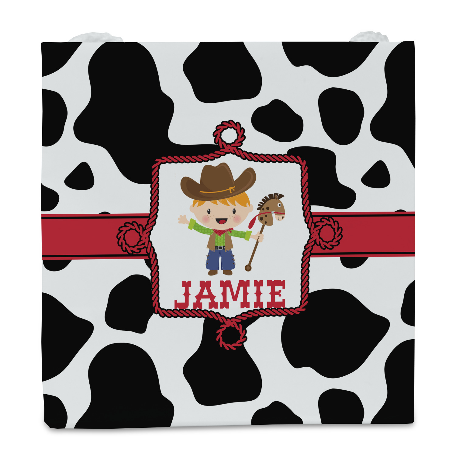 This western themed design is perfect for a cowboy or cowgirl. The background is cow print, with a red ribbon in the center. The label is made of rope and you can customize it by choosing a cowgirl or a cowboy.