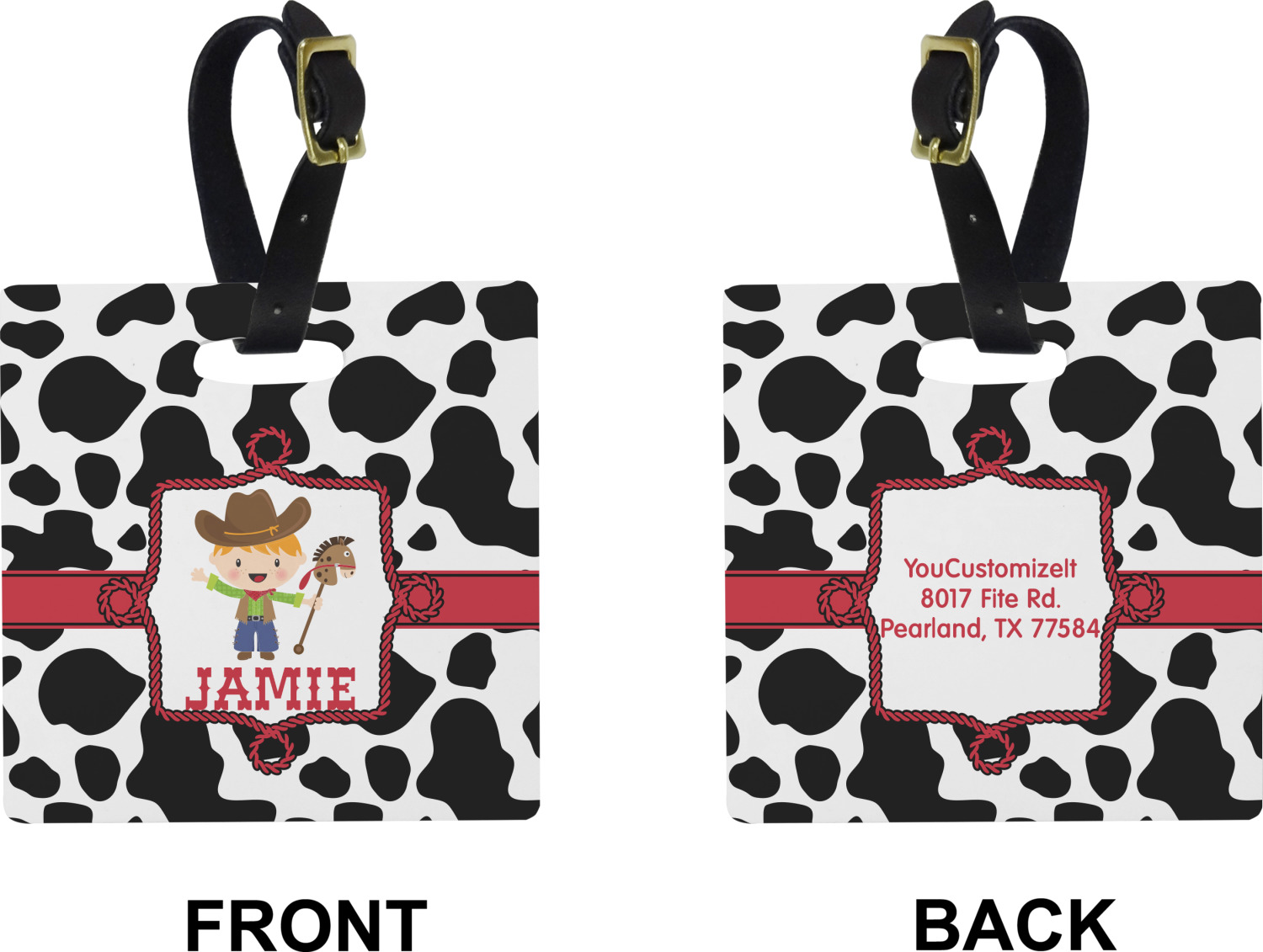 These personalized bag tags are sold in a variety of shapes, so that you may find the product that meets your vision exactly. We sell a round luggage tag, which measures at approximately 4" x 4". Our square luggage tag is about 3.5" x 3.5", while our rectangular version is 2.75" x 4 ".