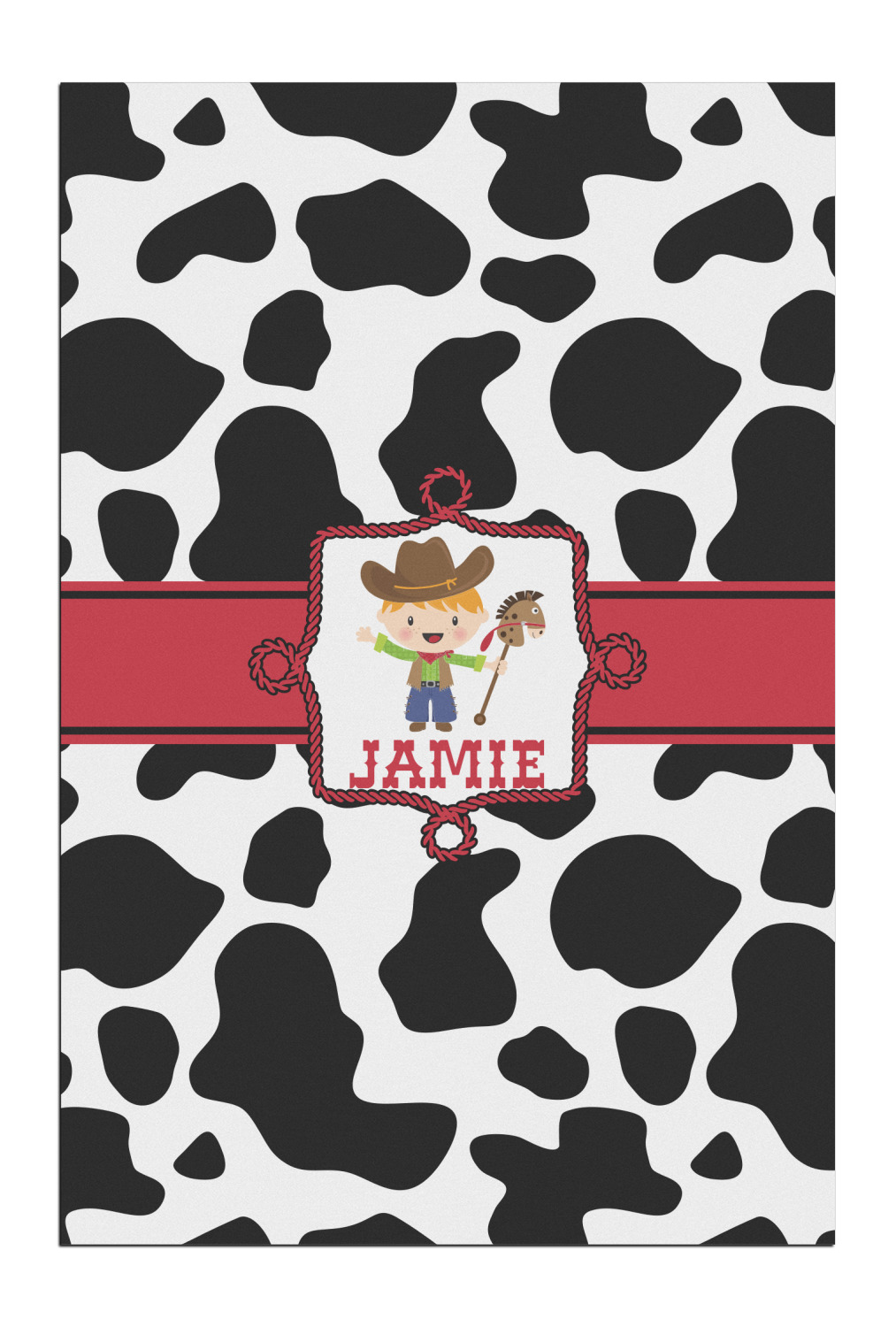 This western themed design is perfect for a cowboy or cowgirl. The background is cow print, with a red ribbon in the center. The label is made of rope and you can customize it by choosing a cowgirl or a cowboy.