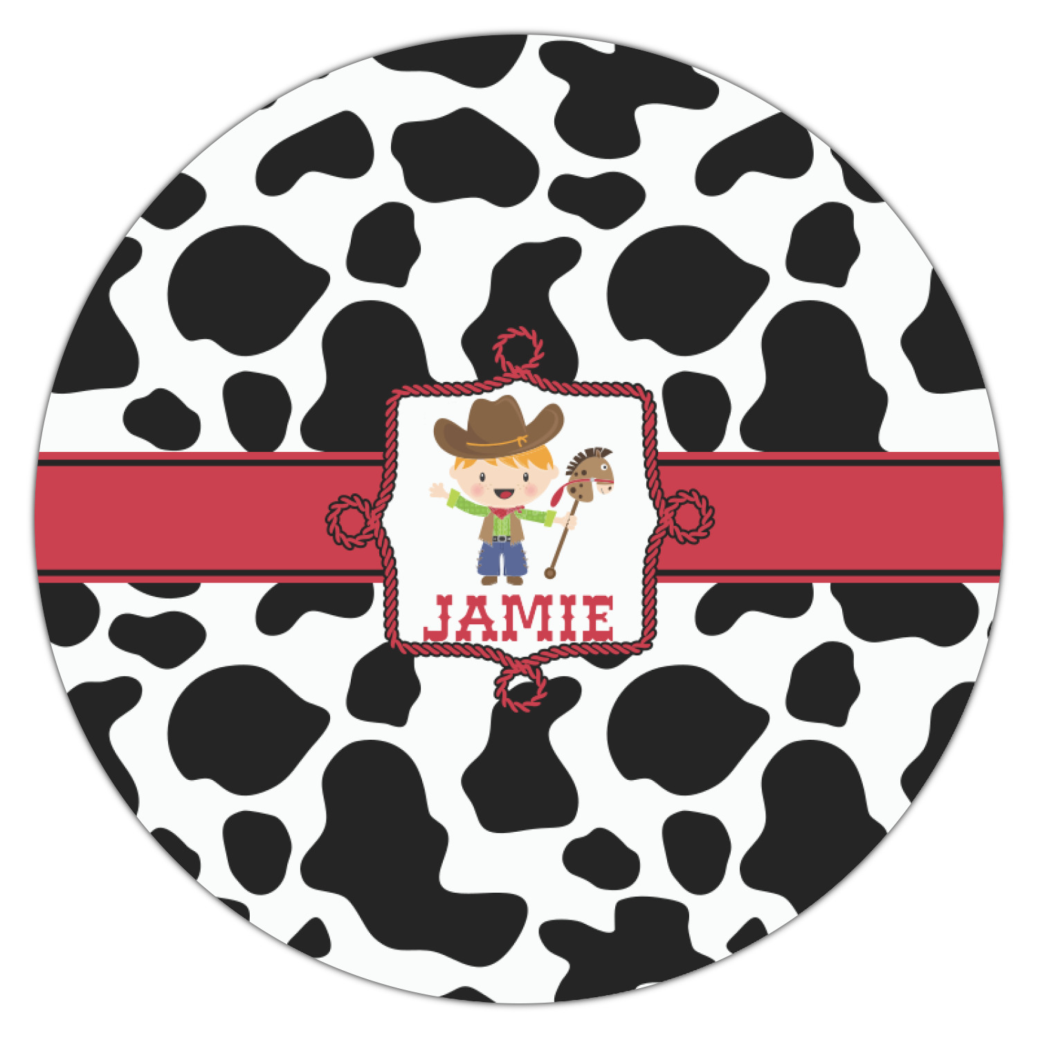 This western themed design is perfect for a cowboy or cowgirl. The background is cow print, with a red ribbon in the center. The label is made of rope and you can customize it by choosing a cowgirl or a cowboy.