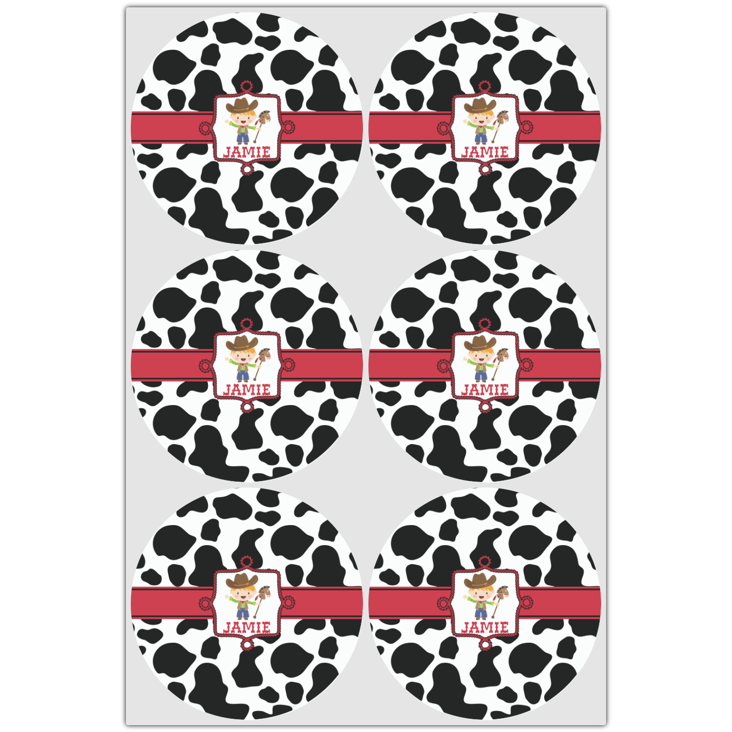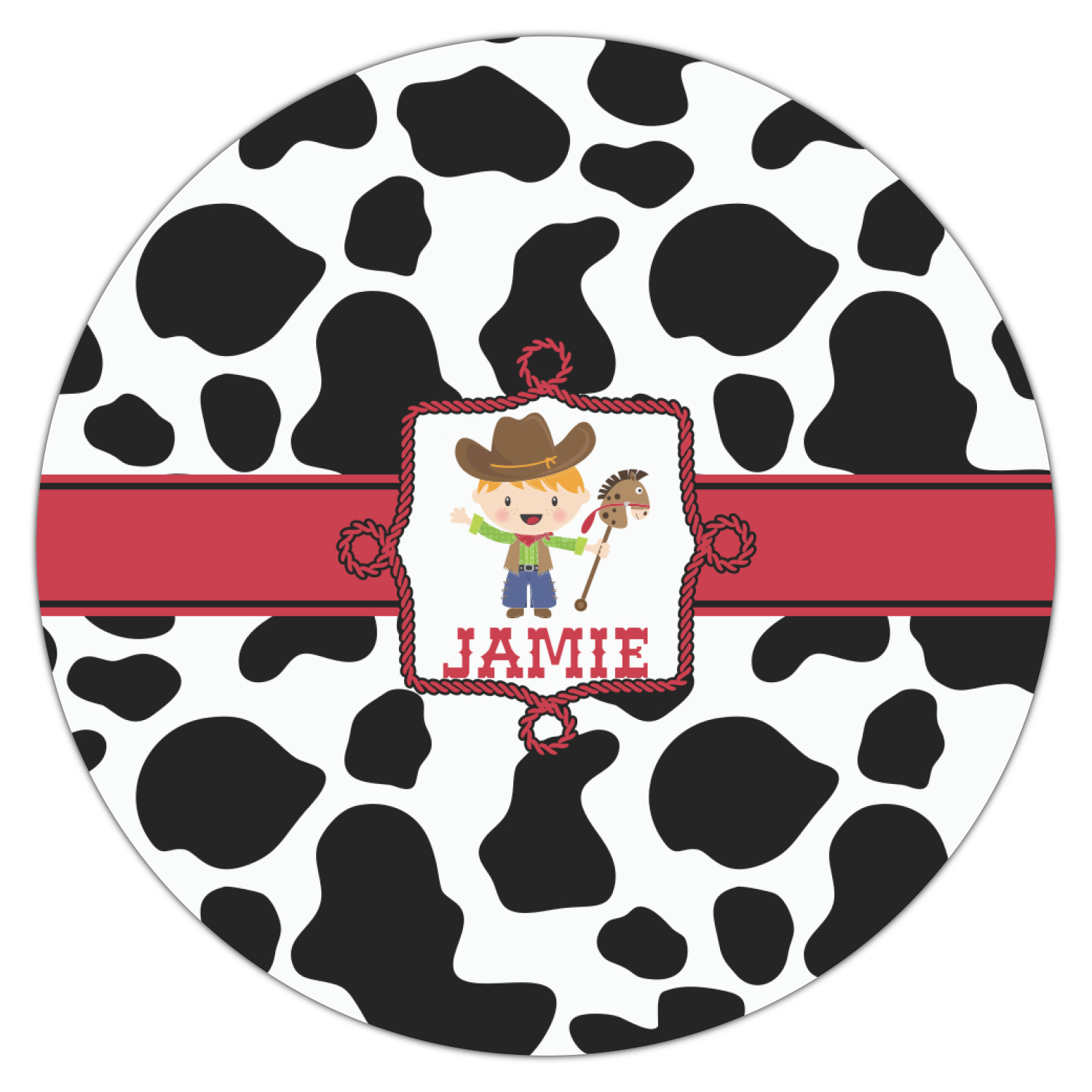 This western themed design is perfect for a cowboy or cowgirl. The background is cow print, with a red ribbon in the center. The label is made of rope and you can customize it by choosing a cowgirl or a cowboy.