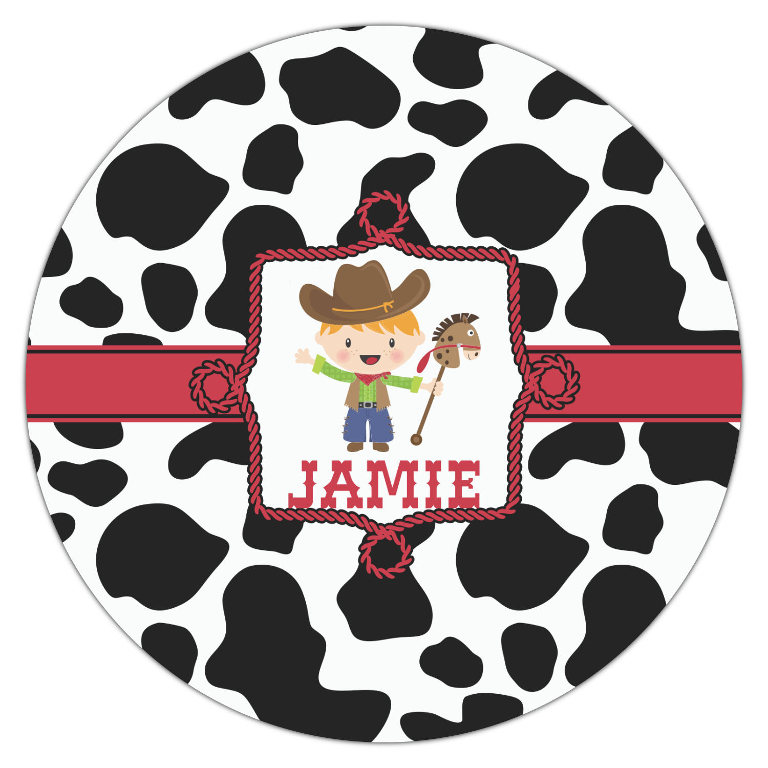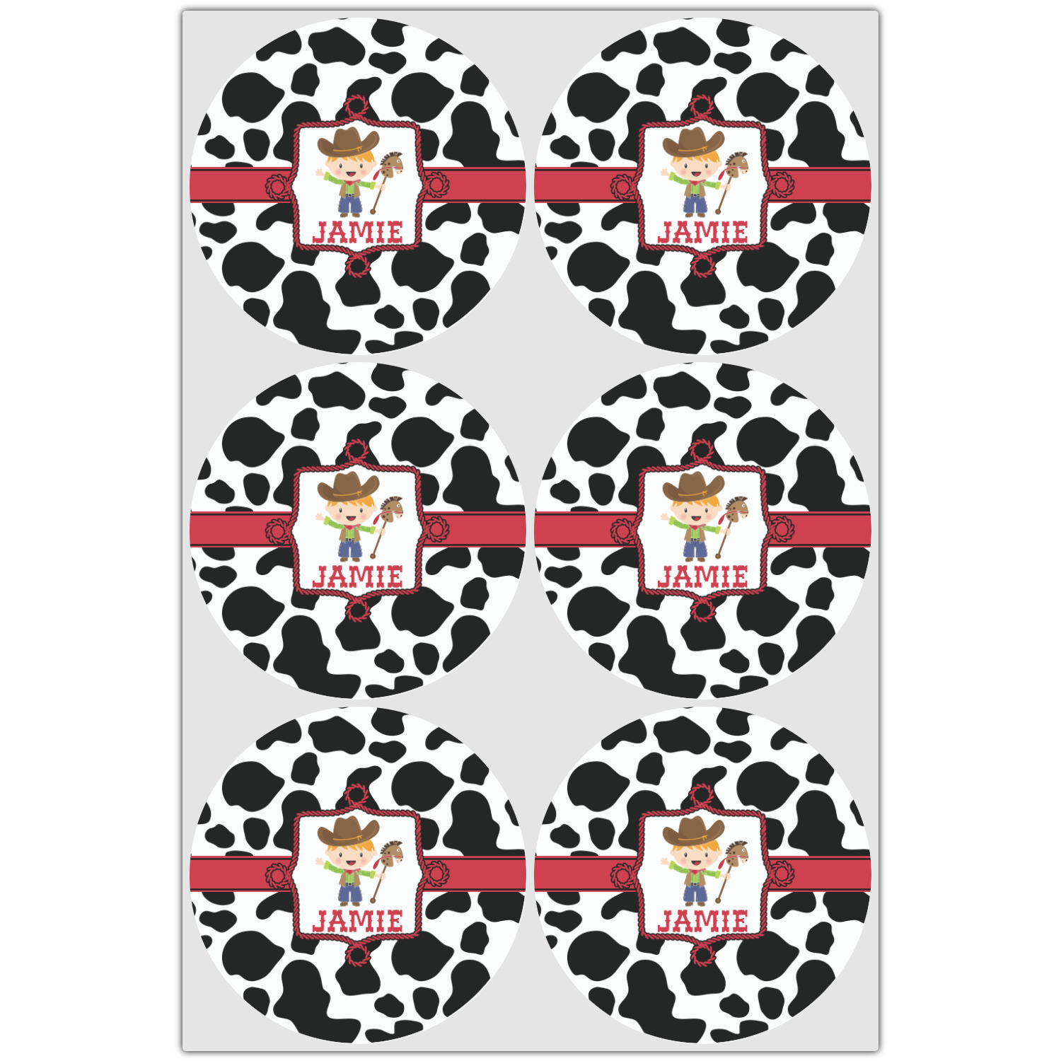 This western themed design is perfect for a cowboy or cowgirl. The background is cow print, with a red ribbon in the center. The label is made of rope and you can customize it by choosing a cowgirl or a cowboy.