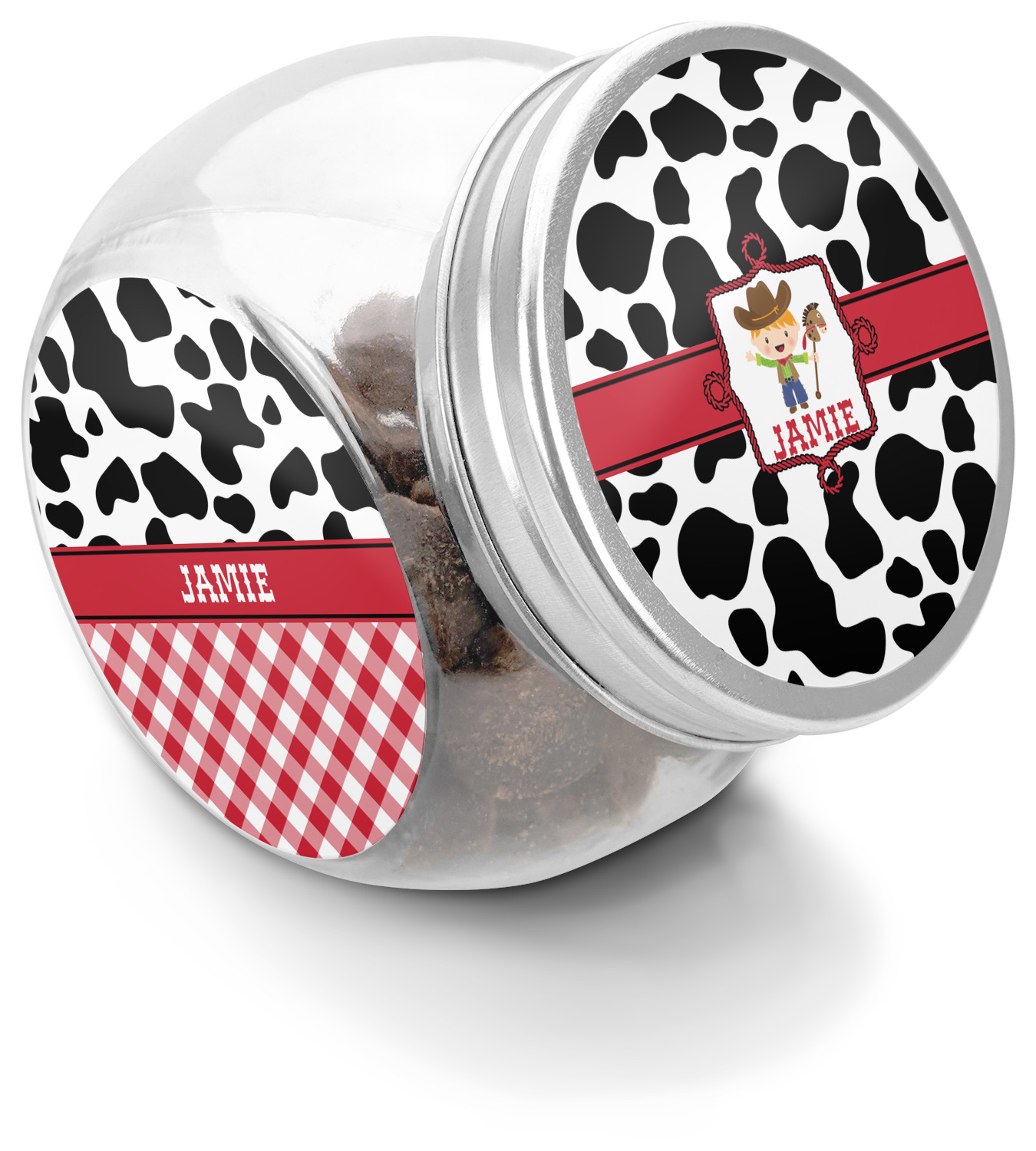 This western themed design is perfect for a cowboy or cowgirl. The background is cow print, with a red ribbon in the center. The label is made of rope and you can customize it by choosing a cowgirl or a cowboy.