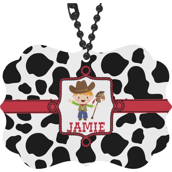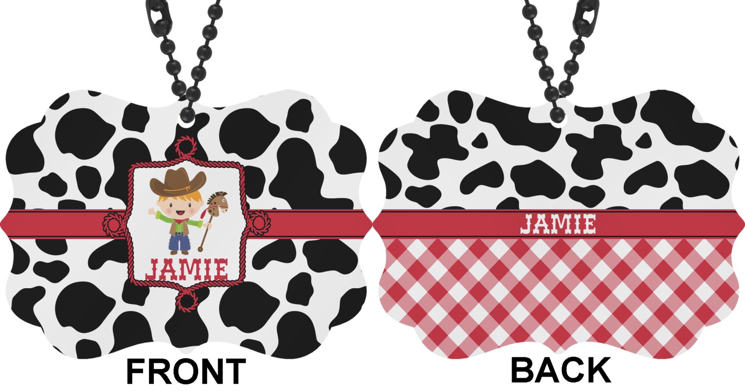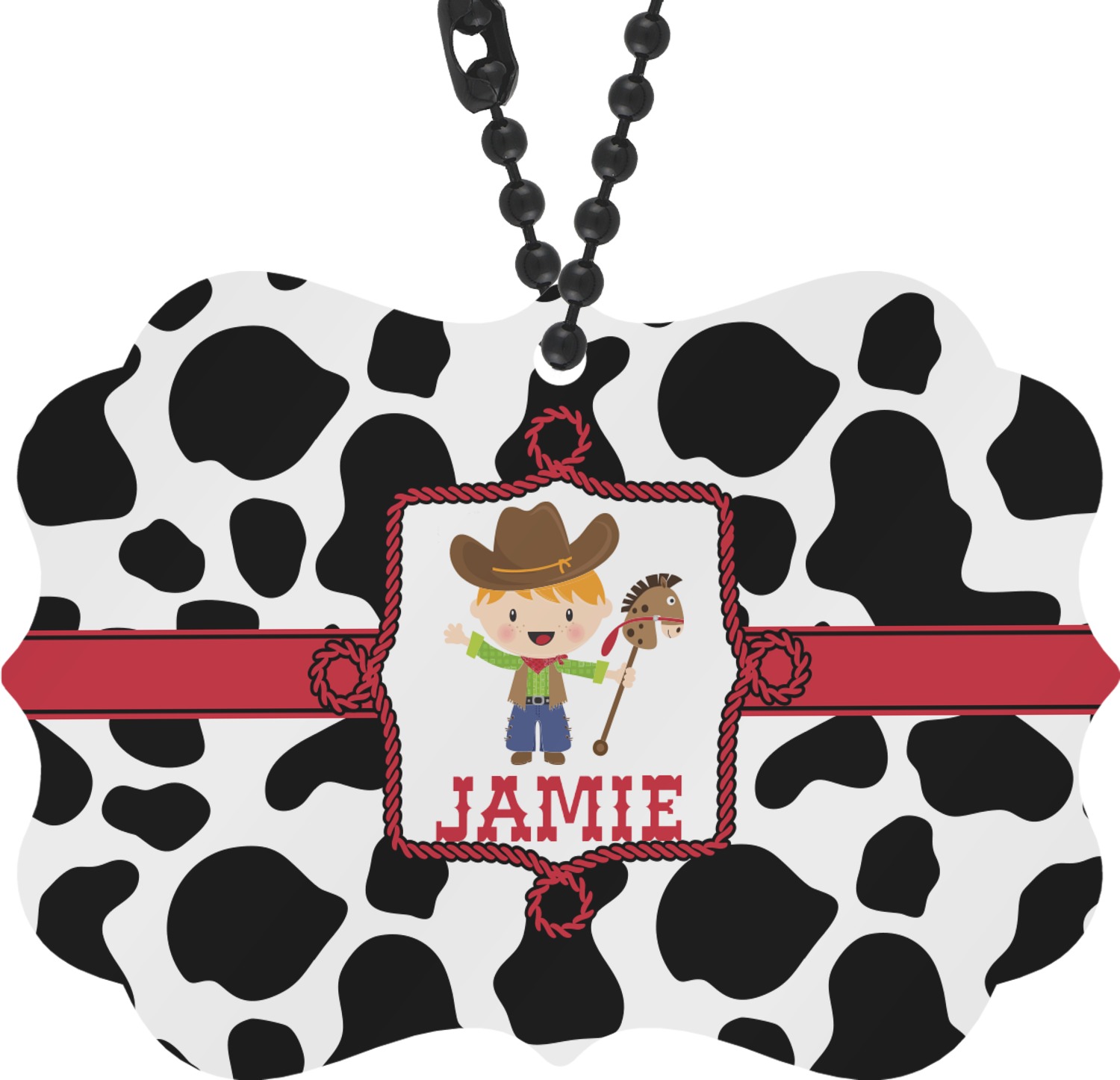 This western themed design is perfect for a cowboy or cowgirl. The background is cow print, with a red ribbon in the center. The label is made of rope and you can customize it by choosing a cowgirl or a cowboy.