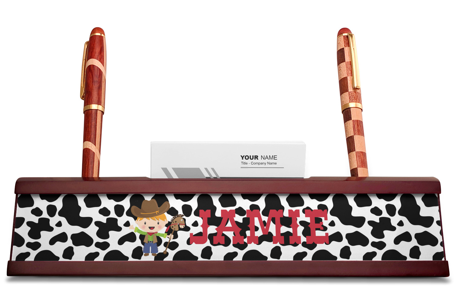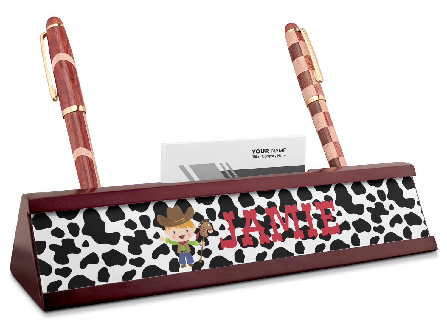 Your desk name plates are crafted from a high-quality, dark-cherry mahogany. At approximately 9.5 by 1.875 by 2.5 inches, this name plaque will fit perfectly, front and center, on your desk. Your customization spans across the entire face of the nameplate. Behind the nameplate lies a skinny slot that can fit approximately 15, traditionally-sized, business cards. You can also store your writing utensils on either side of this custom desk name plate.